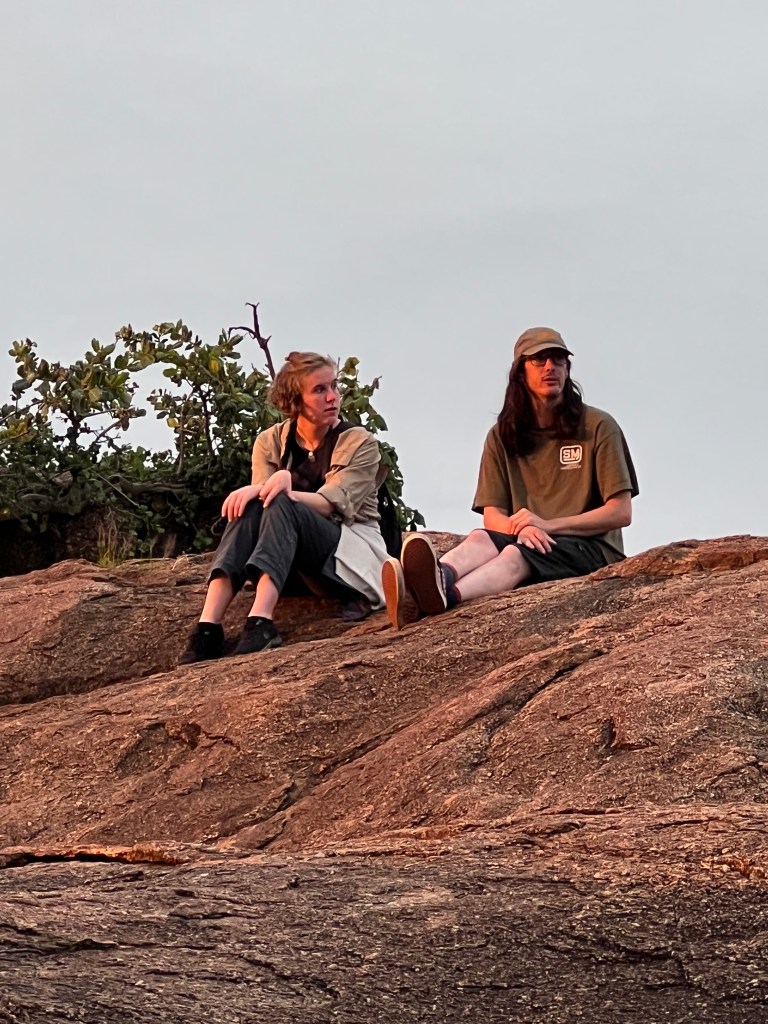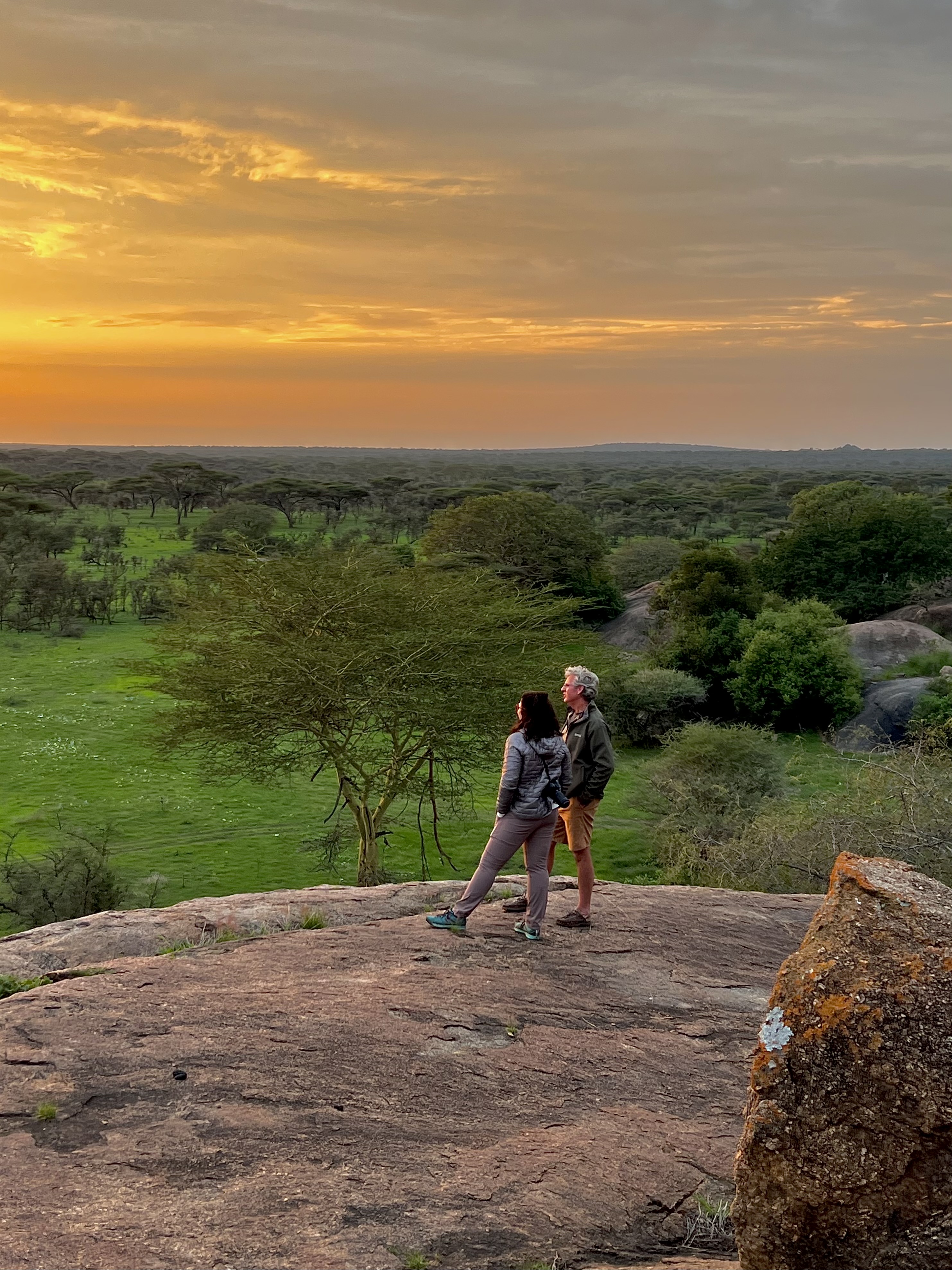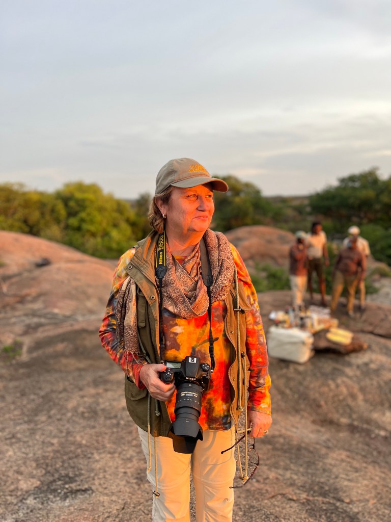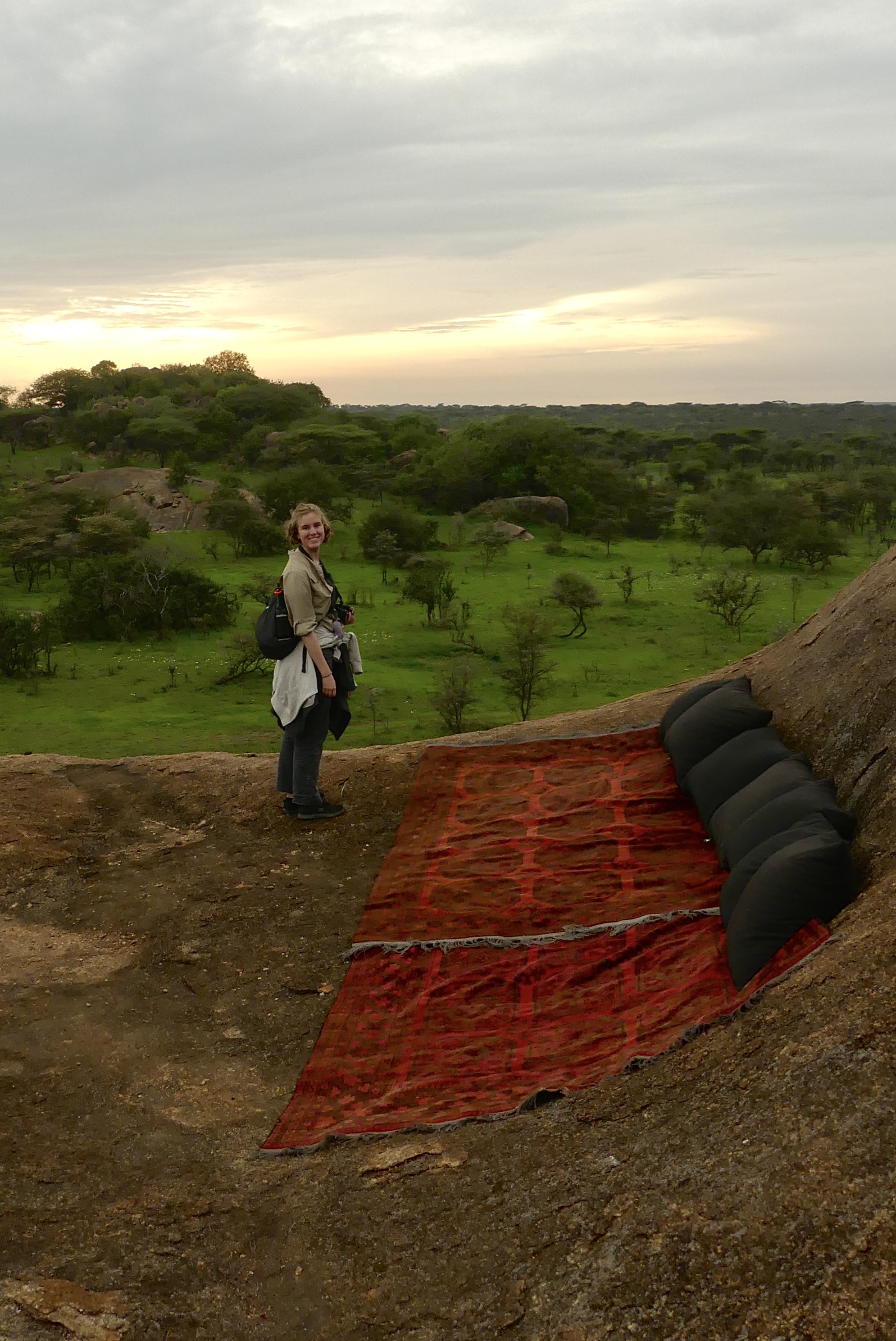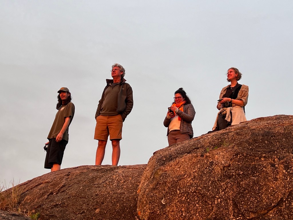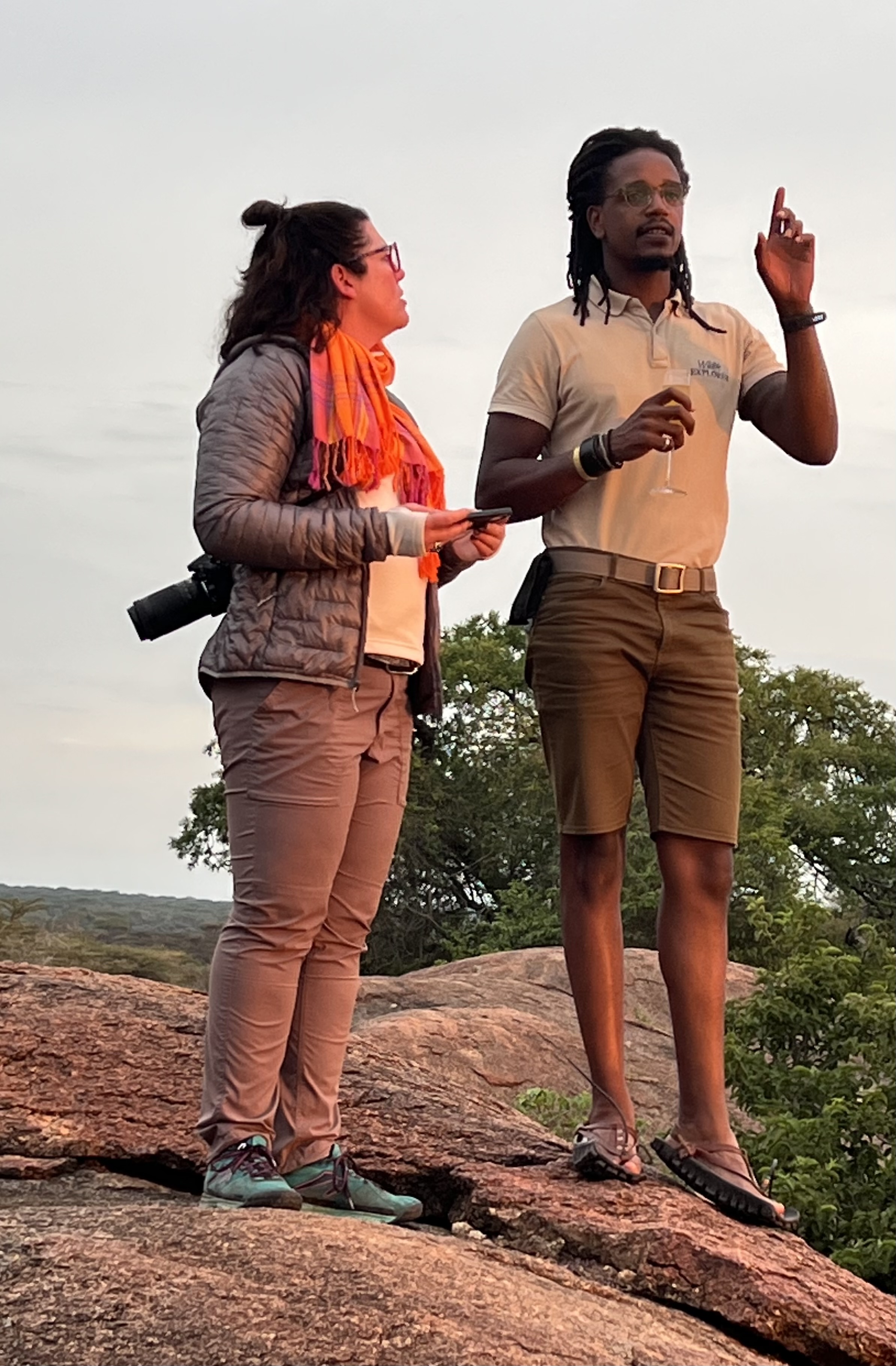 Getting ready for the sundowner! The rocks we have circled over two days to see lions have now become our sunset viewpoint. The only creatures we ran off were the to be able to return. Larkin explained the old history of the granite rocks.