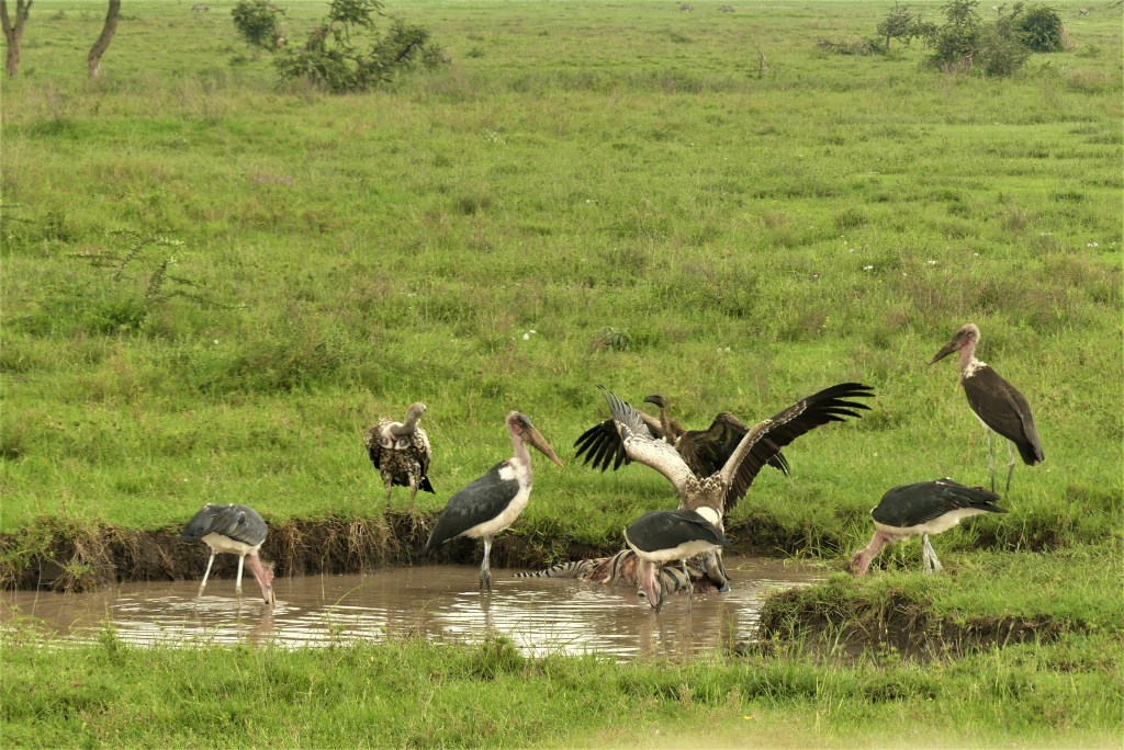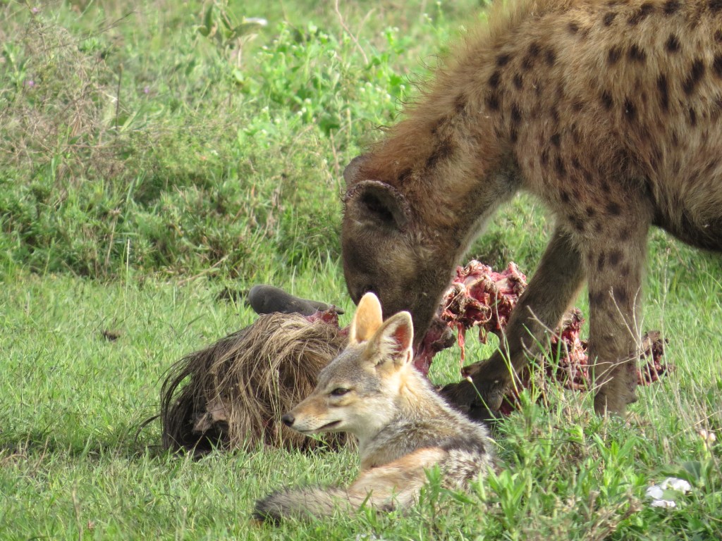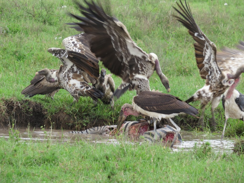They hyena’s and jackal can share a little of sustenance but it was fun to watch the interaction. Hyena’s will take a zebra after they are full to a water hole so they can eat more when they are hungry. However various carnivore birds work hard despite the water eating as much as they can. The giraffe most likely died of natural causes and the birds were feasting there also. Phil wanted to see at least one kill but all we saw were feasts happening already and one cheetah trying to bring down a small impala…he missed.