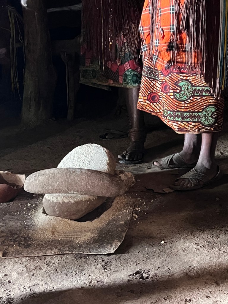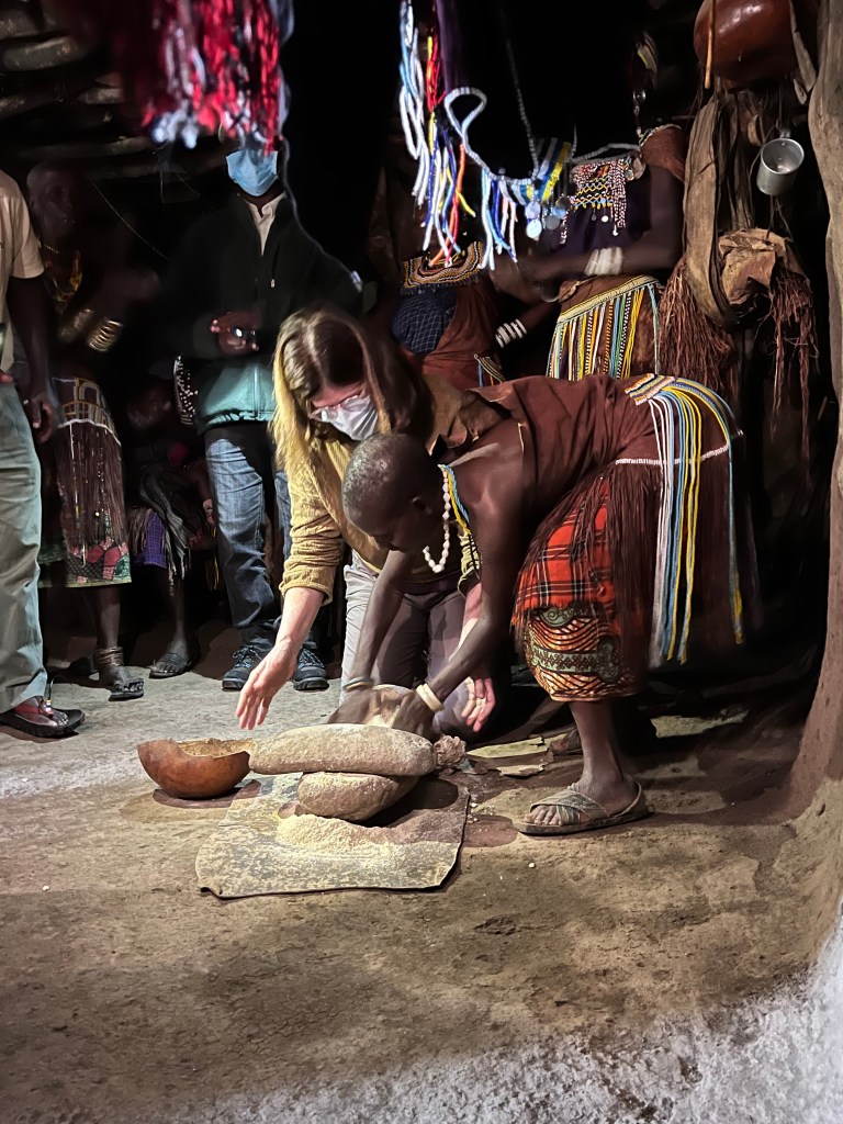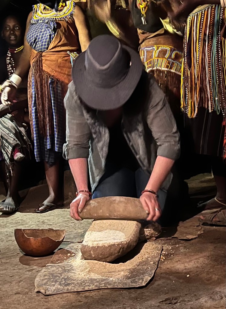As we gathered, the women brought stools for us to sit on as they showed us their hut and how to grind corn. They spent time chasing goats away before we could enter. For some reason the goats always headed toward the door to get into the huts. The huts are dark with no windows. The first room was where they sang as Karen, Jess and Larkin helped grind the corn. The other room was where they slept. They uses white corn which they grind into flour using the stone. They then cook ugali which is basically white polenta – a diet of many east African cultures.