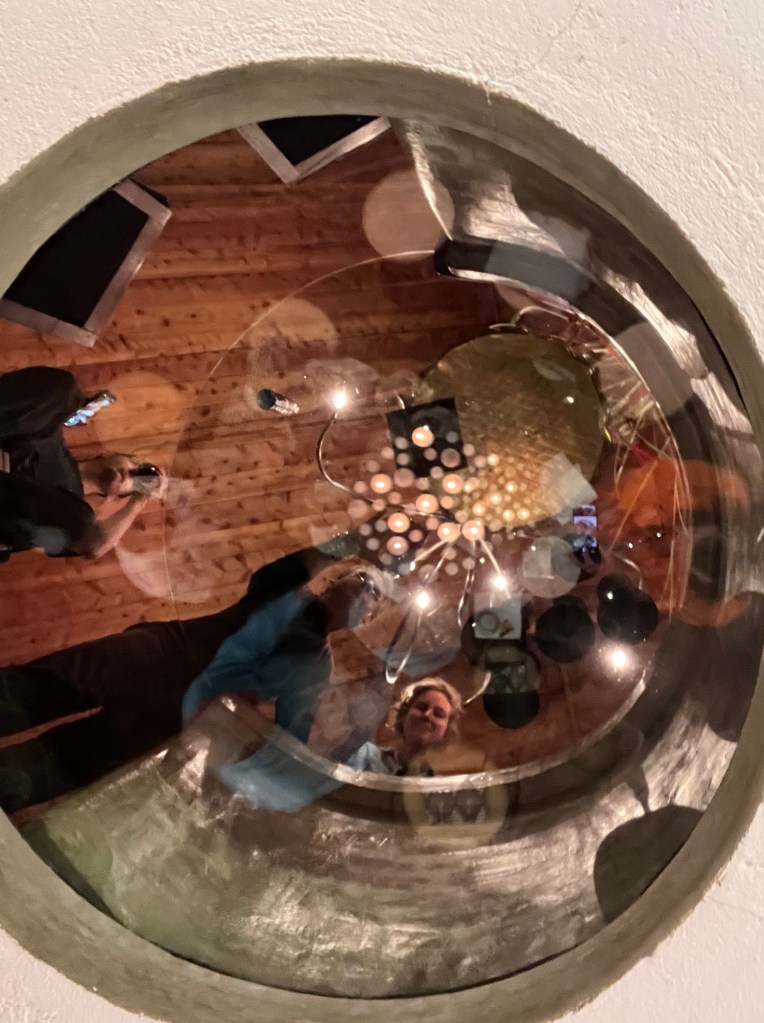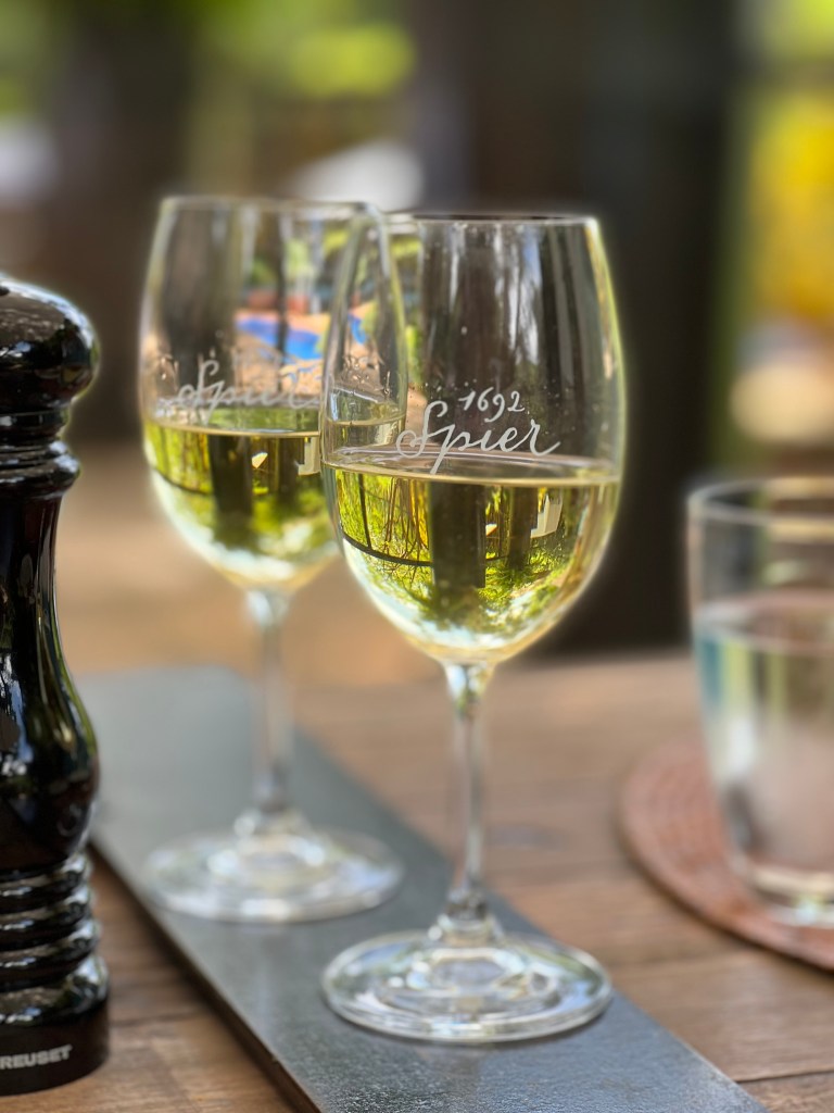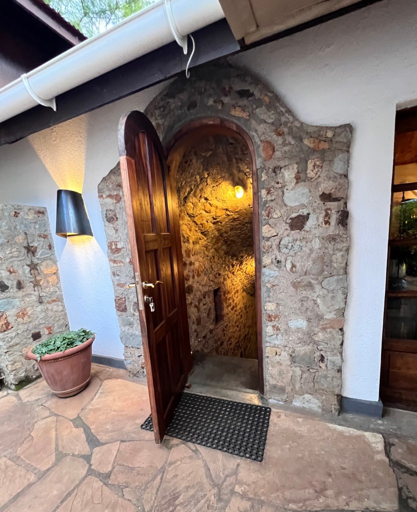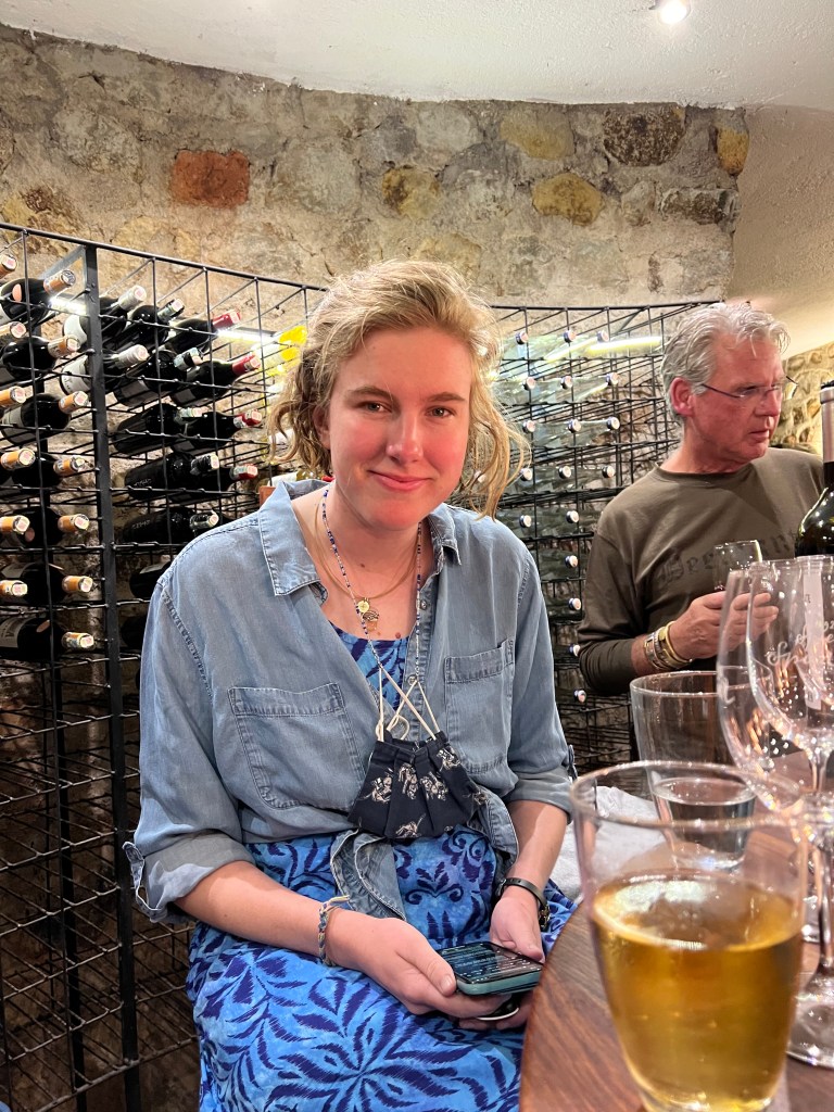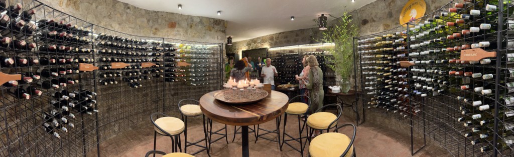 The door to the cellar, the bar above has a glass floor – you can see Larkin looking down before she joined us, Michael at the bar upstairs, Larkin in the cellar and Michael talking about how wine labels work with Gary and Jess.Most of the wines served are from South Africa and are very delicious.