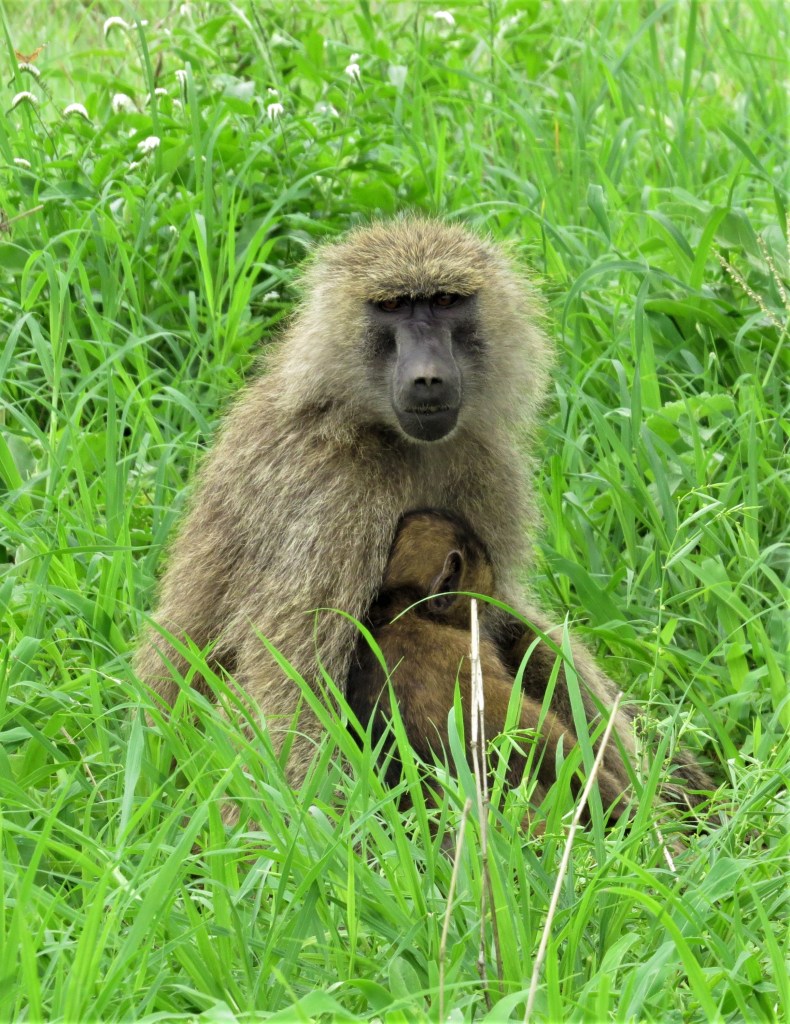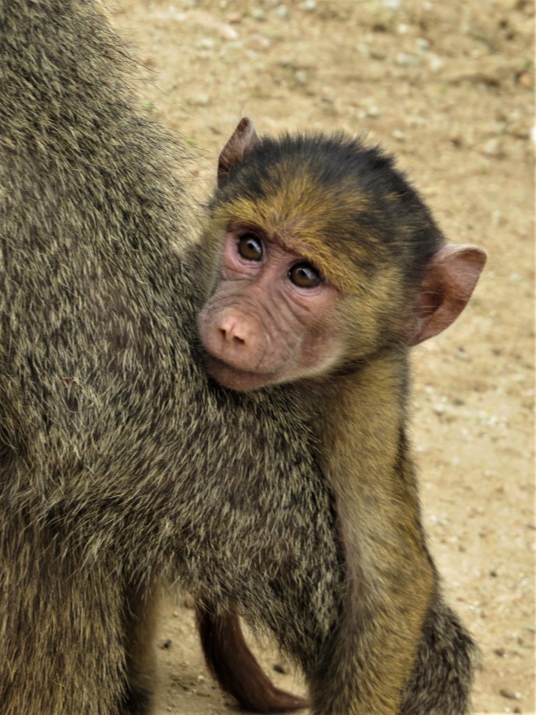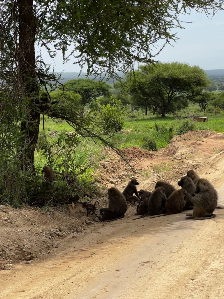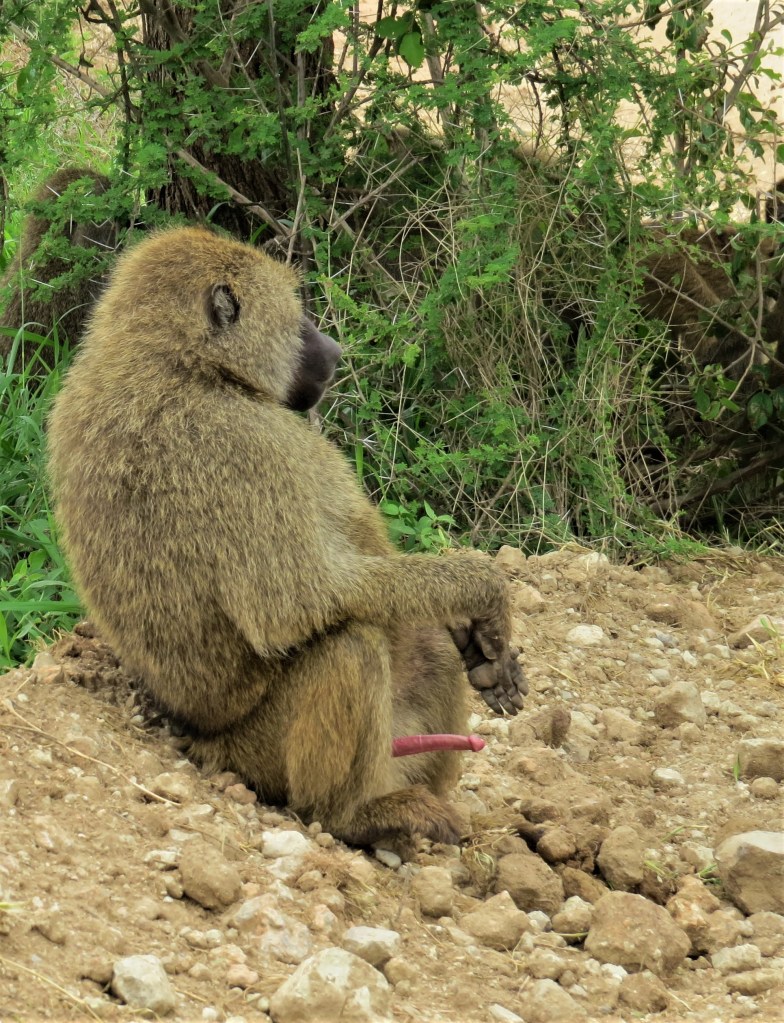 The Tarangire National Park is named after the Tarangire River which cuts the park in half mostly from north to south and supplies water year around to the wildlife. The park is nicknamed “park of the giants” with its massive ancient Baobab trees. In the Mbugwe language Tarangire means the river of the warthogs. The park has the most animals during the dry season which is June to October. We were there in February and there were still loads of animals to observe. The geology – with the river and its banks, the rocks and hills as well as the swamp were such different vistas from the mostly flat plains of the Serengeti or the enclosed crater of the Ngorongoro. Visions of majestic Baobab trees, acacias and even seeing a few palm trees were breathtaking. The park is known for its year around herds of large elephant. Elephants love to eat Baobab trees so only the huge centuries old specimens are remaining. Elephants also love mahogany trees so the ones we observed were more like short small bushes kept trimmed as their new growth emerges – almost like someone planted rows of little trees. Potato chips, napkins and toilet paper – very important supplies. The first baboon troop we came across looked to be having a convention in the street.