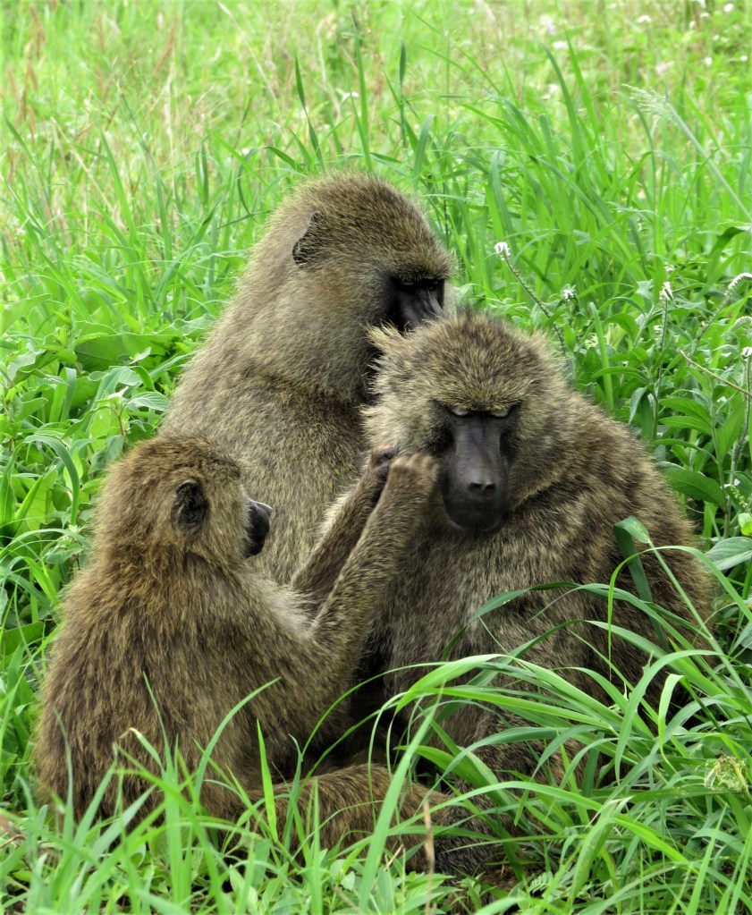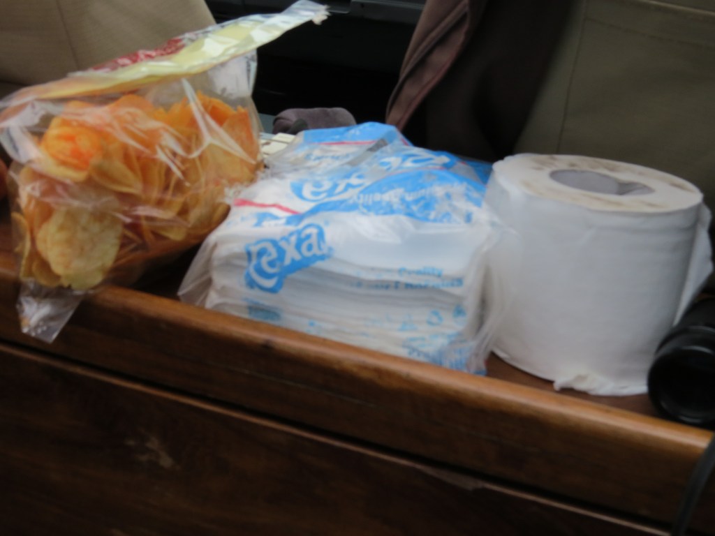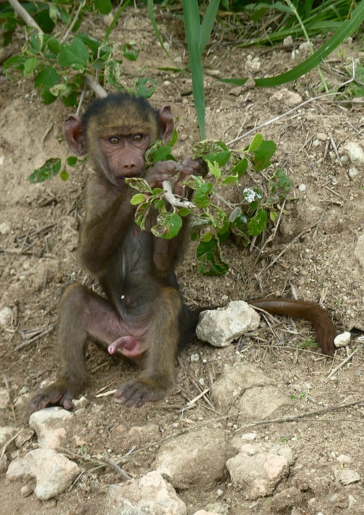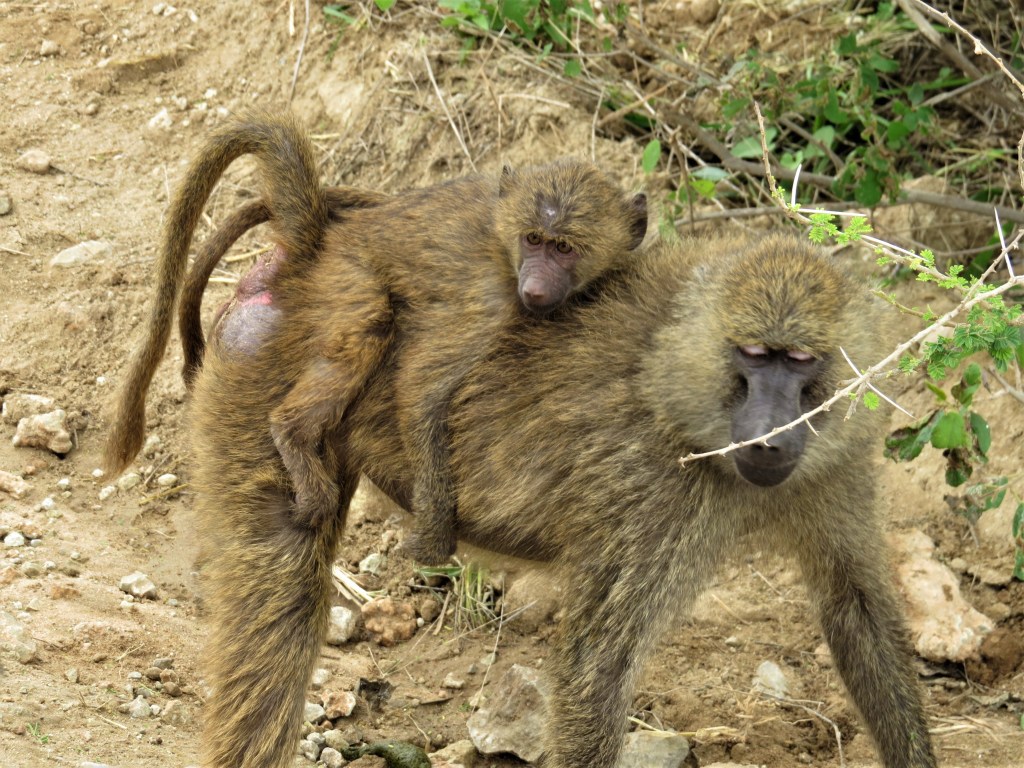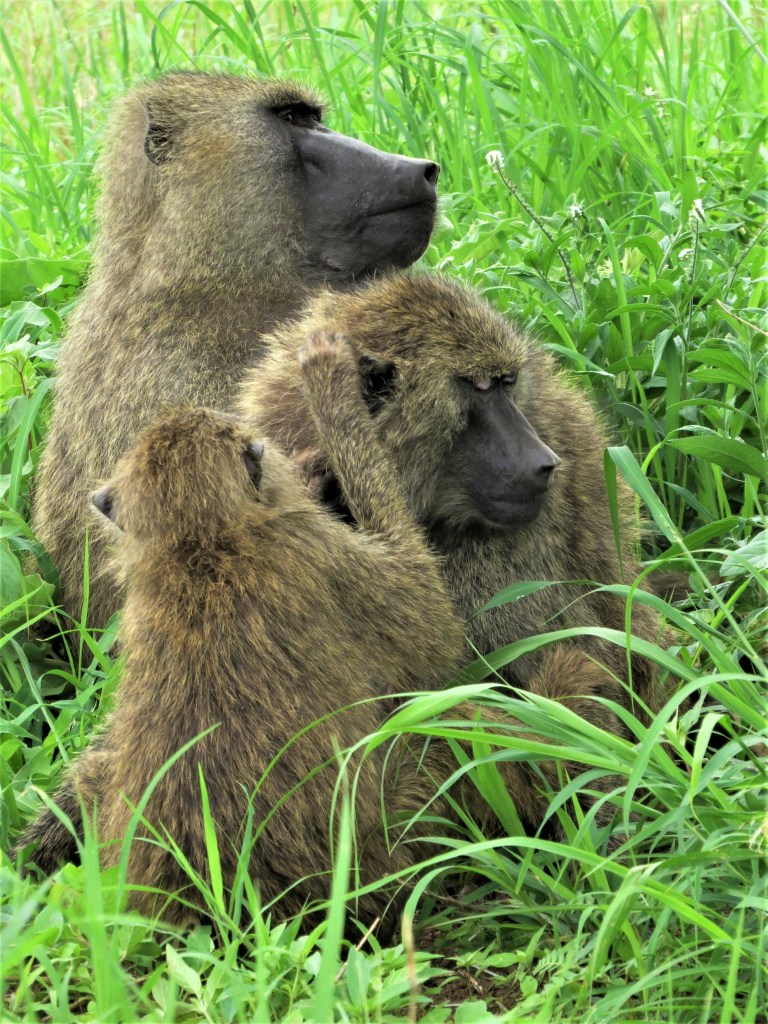 The Tarangire National Park is named after the Tarangire River which cuts the park in half mostly from north to south and supplies water year around to the wildlife. The park is nicknamed “park of the giants” with its massive ancient Baobab trees. In the Mbugwe language Tarangire means the river of the warthogs. The park has the most animals during the dry season which is June to October. We were there in February and there were still loads of animals to observe. The geology – with the river and its banks, the rocks and hills as well as the swamp were such different vistas from the mostly flat plains of the Serengeti or the enclosed crater of the Ngorongoro. Visions of majestic Baobab trees, acacias and even seeing a few palm trees were breathtaking. The park is known for its year around herds of large elephant. Elephants love to eat Baobab trees so only the huge centuries old specimens are remaining. Elephants also love mahogany trees so the ones we observed were more like short small bushes kept trimmed as their new growth emerges – almost like someone planted rows of little trees. Potato chips, napkins and toilet paper – very important supplies. The first baboon troop we came across looked to be having a convention in the street.
