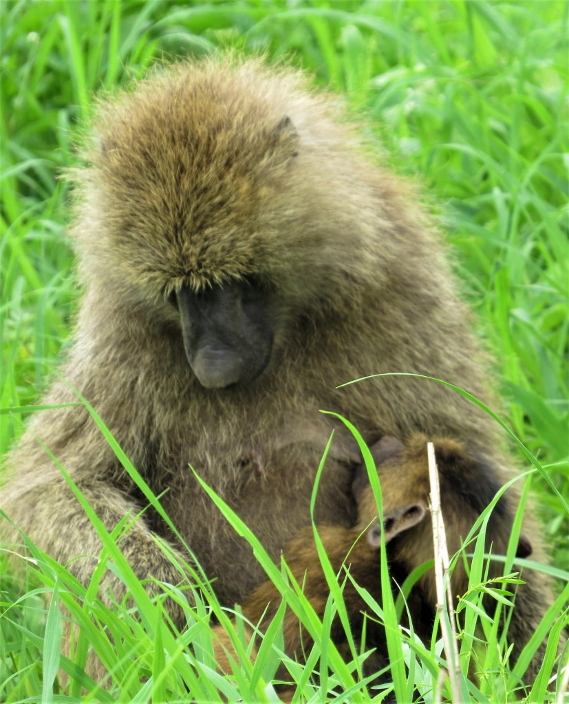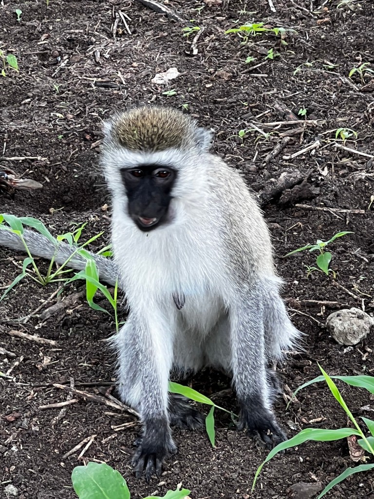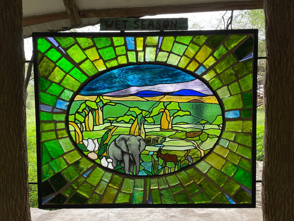 The entry into the park had nice restrooms including a stunning piece of stained glass hanging in an open building as well as black faced monkeys on the way to the restrooms and in the tree over our Land Cruisers. Someone in our group forgot to close the door on one of our Land Cruisers and in the blink of an eye a banana was gone. Note – keep telling the safarists to keep the vehicle doors shut! Those black faced monkeys are resourceful.