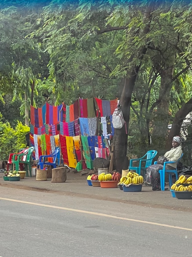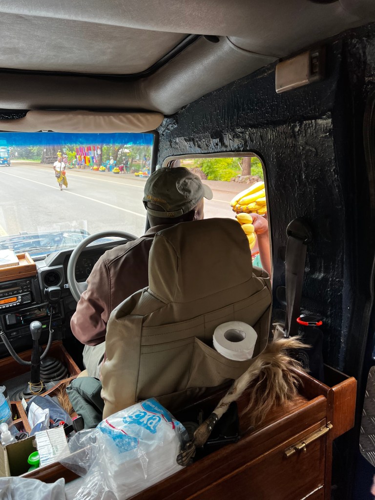 On our way to Tarangire National park from the Ngorongoro Crater we traveled on more “normal” busy roads. Mzee always stops on the way to the Tarangire for fresh bananas along this route. Once the ladies see us pull over, everyone comes running and of course bought both yellow and orange bananas. All sorts of other things are for sale on the side of the road as well – very colorfully displayed.