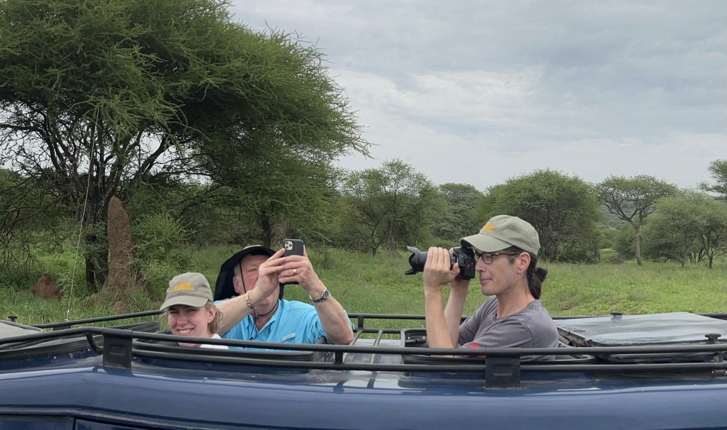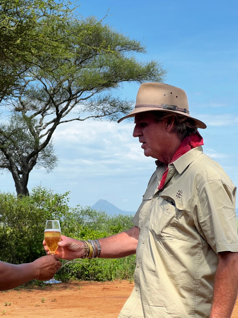 More visions across the landscape including baobab trees and acacia’s. Gary enjoying a nice glass of sparkling wine as we arrived in camp. Larkin and Jess heading to their tent which was just before ours. They had a nice tall termite mound which helped Michael and I realize the next tent was ours. They do all look the same – with incredible views looking out on the park. These tents were slightly more angular so we had to duck our heads to get in the the bathroom area but it also had a screened in veranda.