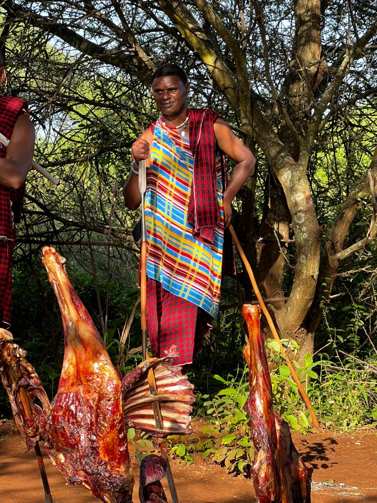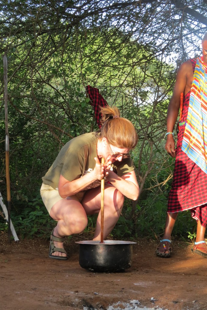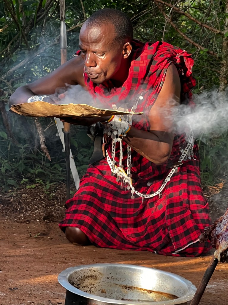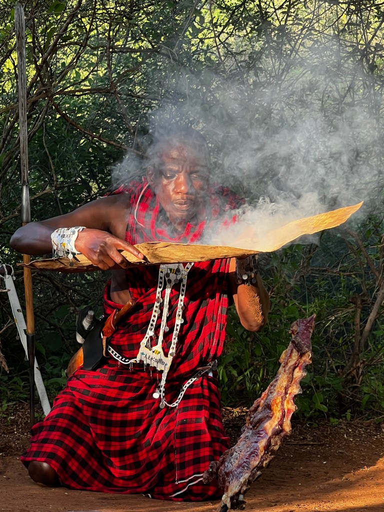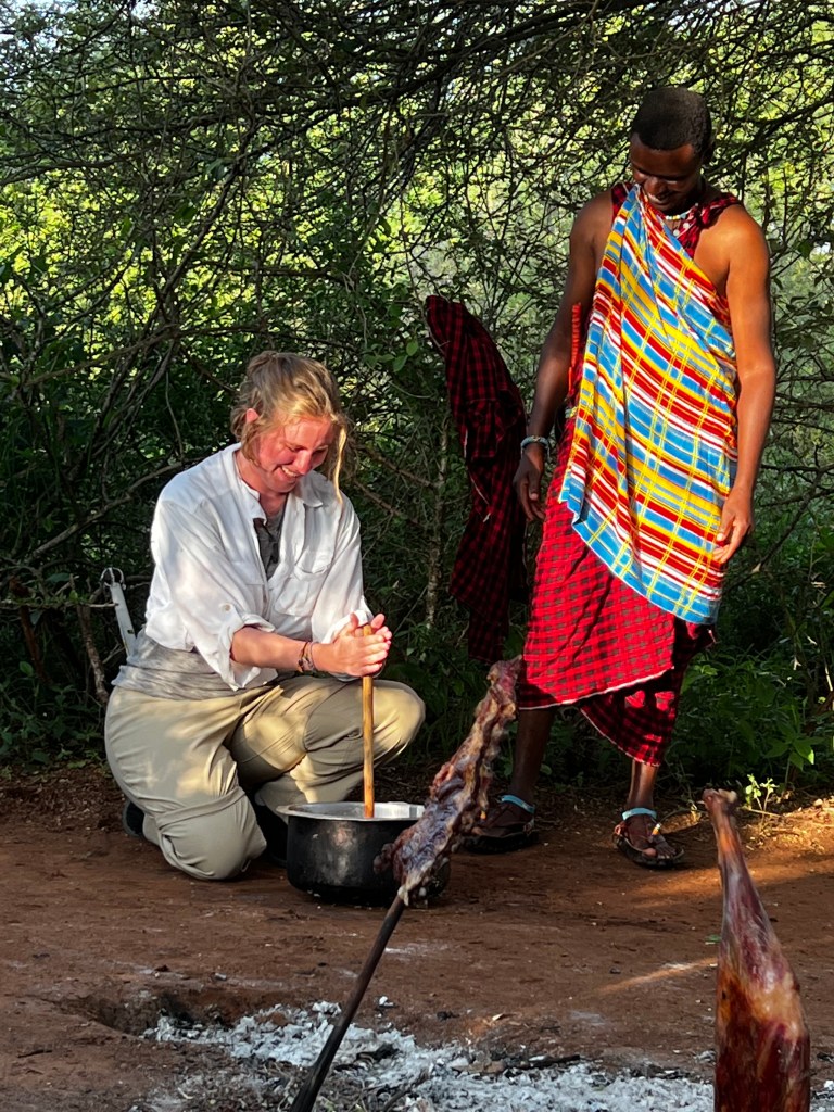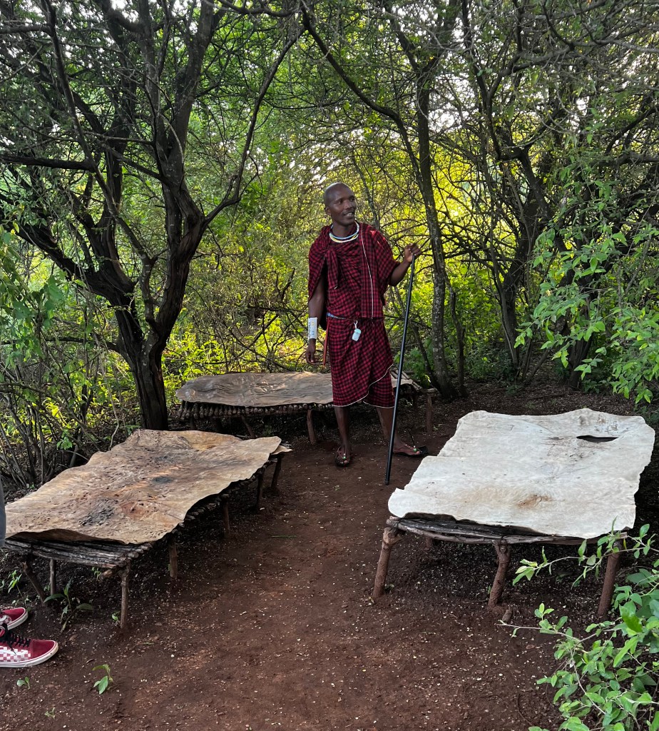 When we were settled into our tent we were hosted by the Maasai team to have an experience of the traditional Olpul. The team had been preparing goat for us all afternoon. Oh joy! We did taste it – my oh my, the goat stew might have been more tasty with longer prep time and more spices! However I did enjoy the goat ribs as it was more like jerky – the liver stayed on the board when it came by my location – not thanks. We were shown how they start fires and how to stir the soup properly. Within this Boma we were also shown their “cots” where they would traditionally sleep. Michael and Larkin took a walk to be shown the native plants that are used in traditional medicines. They also did a traditional dance – Maasai men can jump!