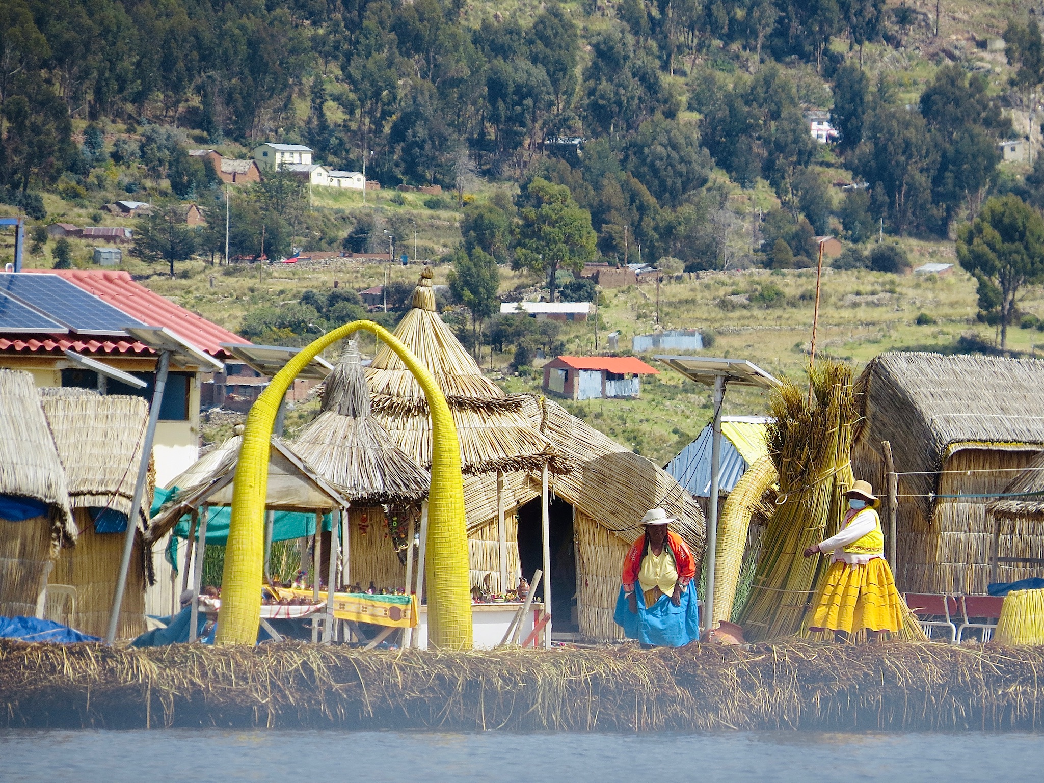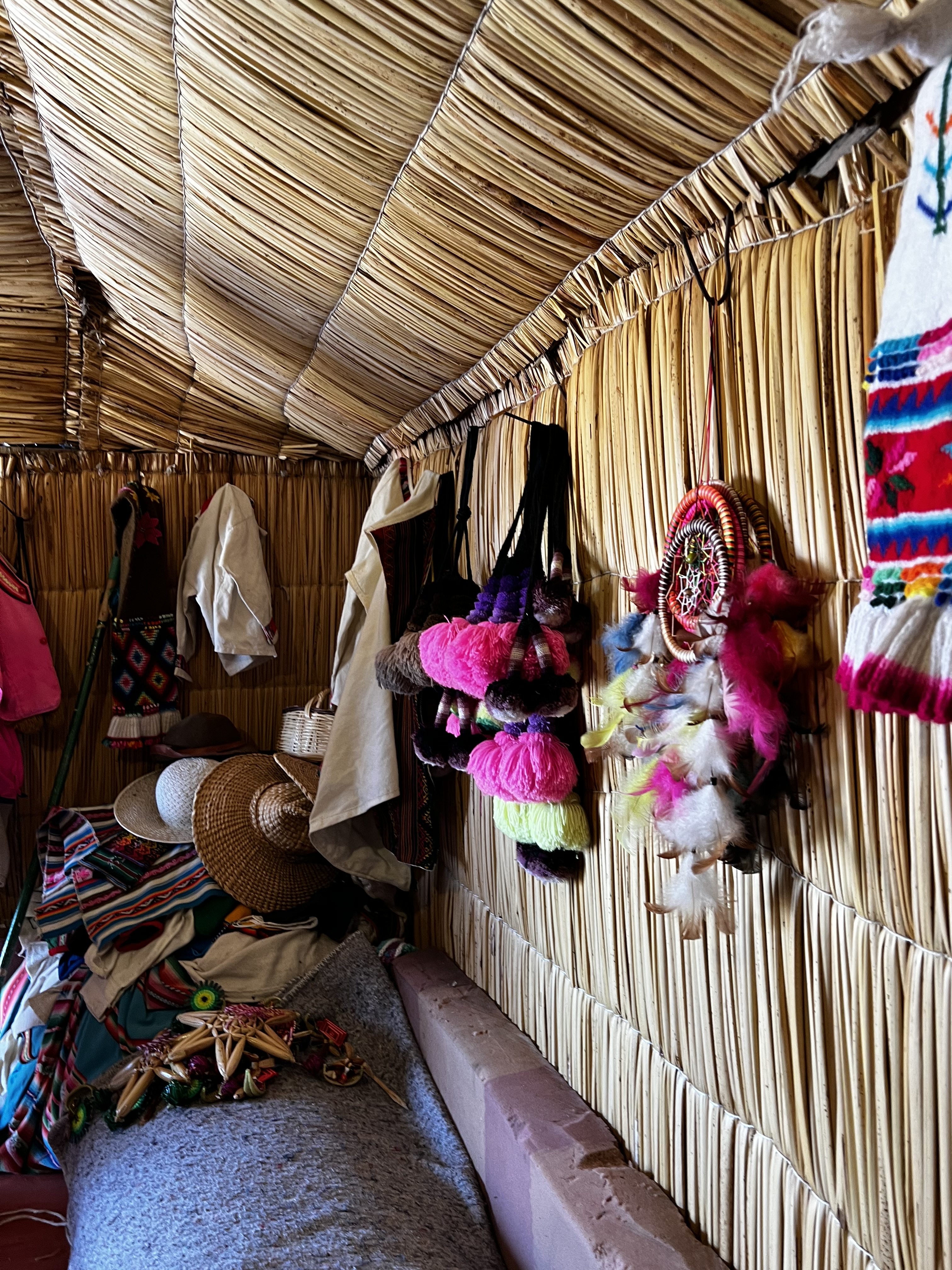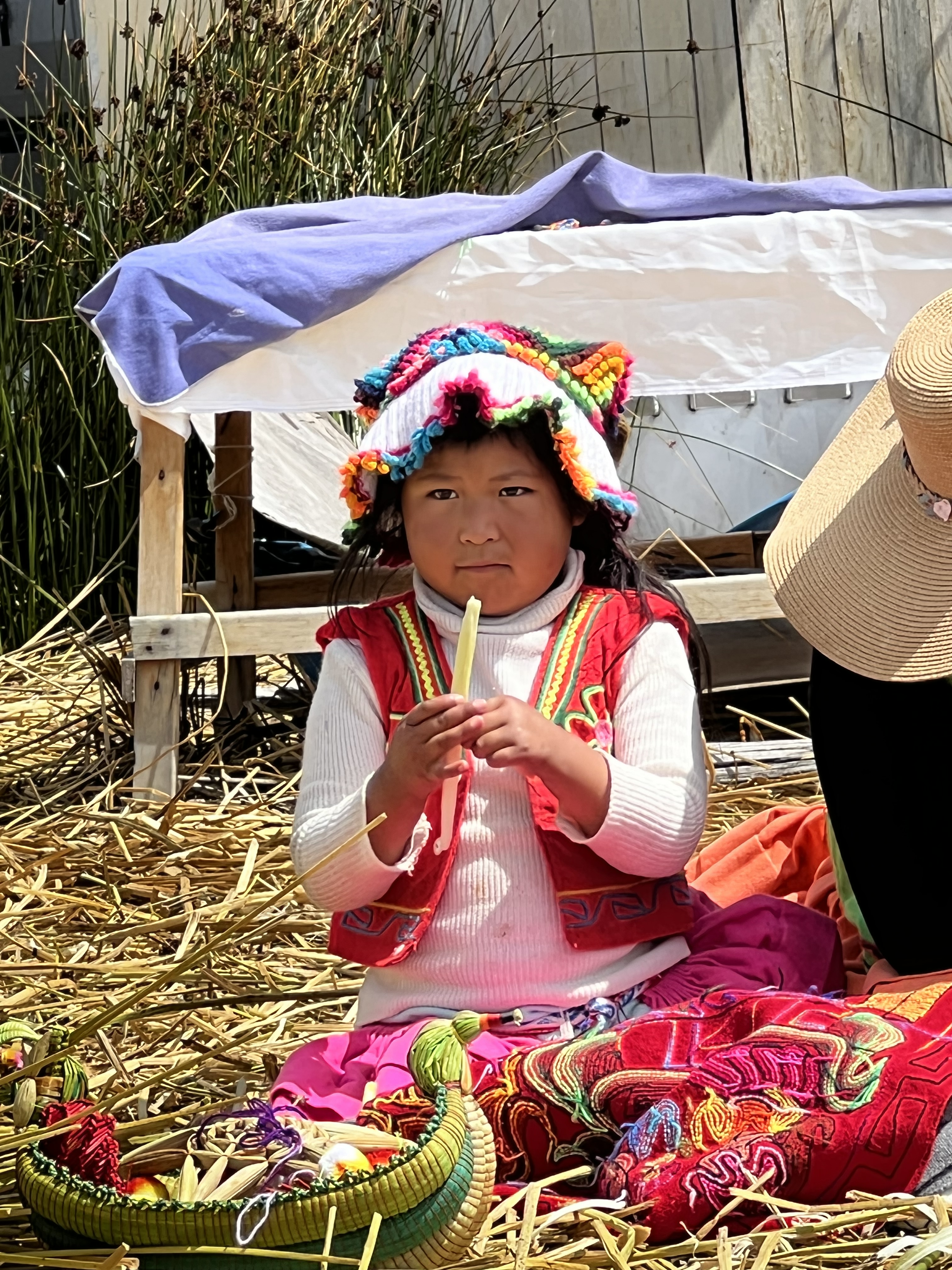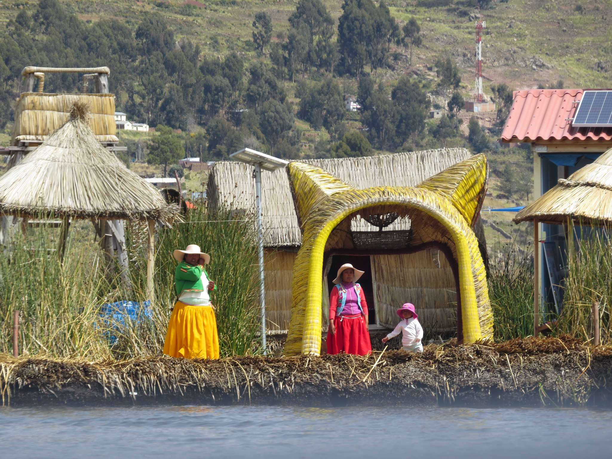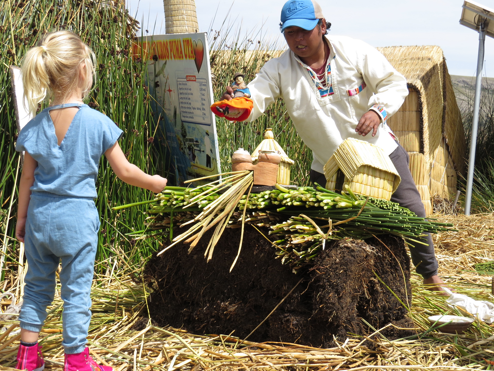 The islands are made of Totora which is a reed that grows in shallow places. They also use these reeds for boats, furniture and houses. Every 20 days the men add new layers of these reed linking them with ropes and stakes. The Uros Islanders eat the soft white part of the totora that provides them with many of the nutrients they need to survive. They also hunt and fish, raise Ibis for eggs etc and they are known to go to Puno and bring food staples back also.