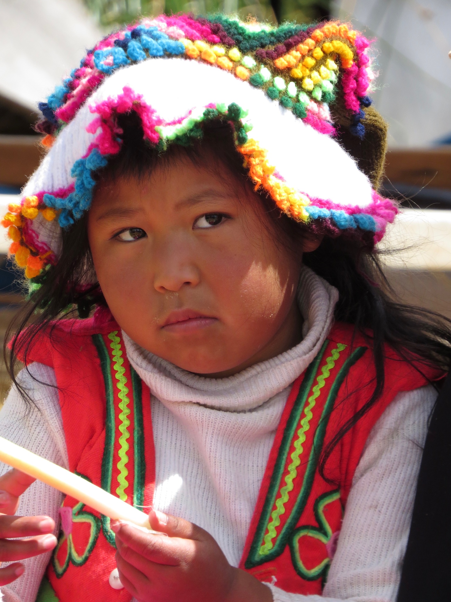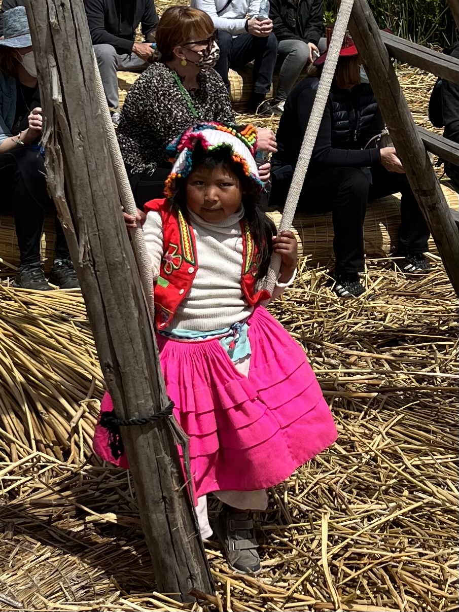 Oh my the glorious colors. It was enough to visit and enjoy them sharing their life for extra money, but I’m glad we didn’t stay overnight. Lake Titicaca is the largest high altitude lake in the world. The Uros people are mysterious and maintain traditions of pre-Inca as well as the Inca Empires. Andean culture consider Lake Titicaca as the cradle of the Sun and the Inca Empire. Lake Titicaca also borders Bolivia. We learned the history of why Bolivar has no access to the Pacific – neither Peru or Bolivia like the Chileans (we heard) and when the Chileans started a war Peru fought but Bolivia gave in. When the the Bolivians gave up, they lost access to the Pacific. I have not read up on whether this is a true account or not, but it does seem plausible.