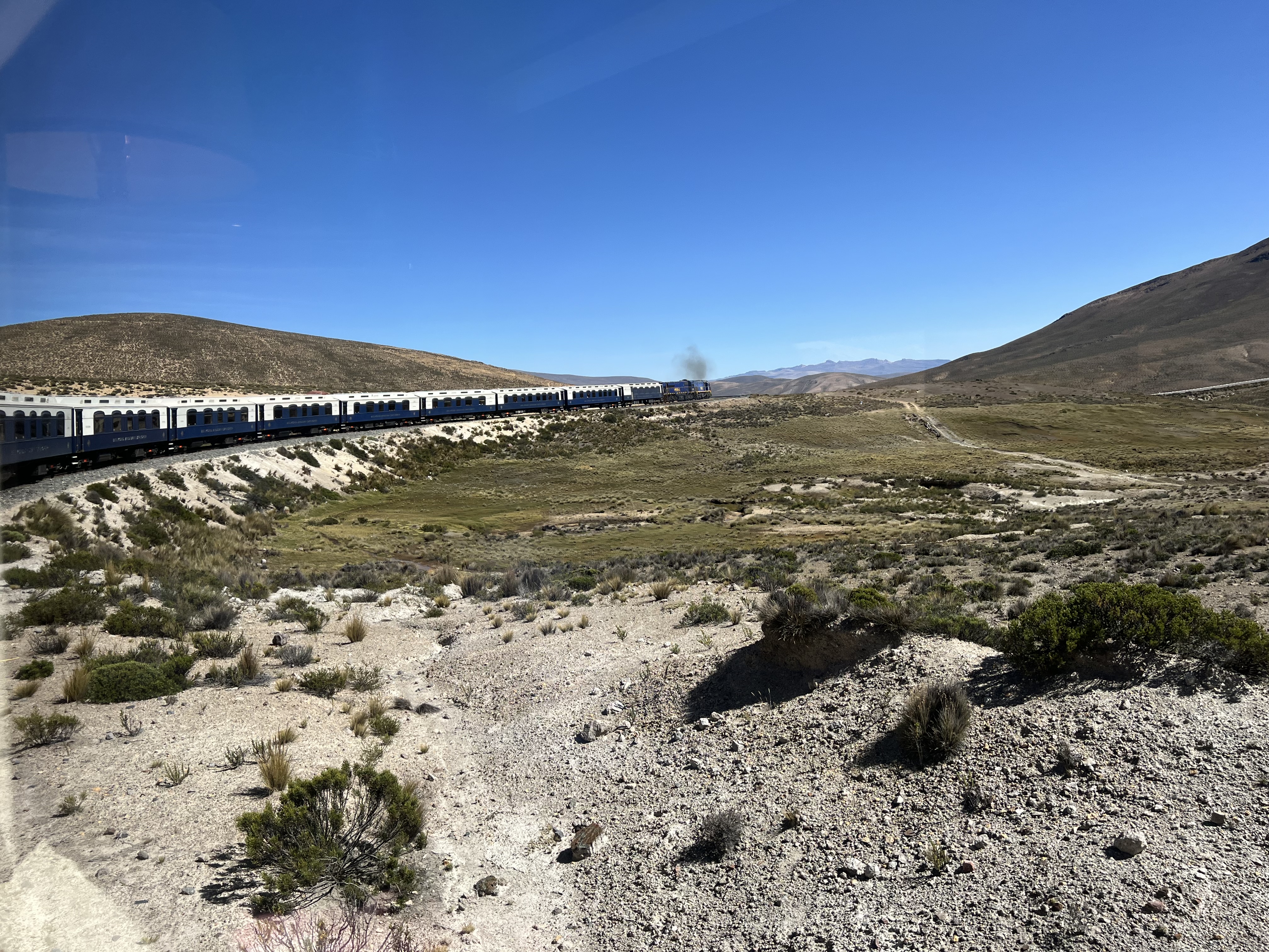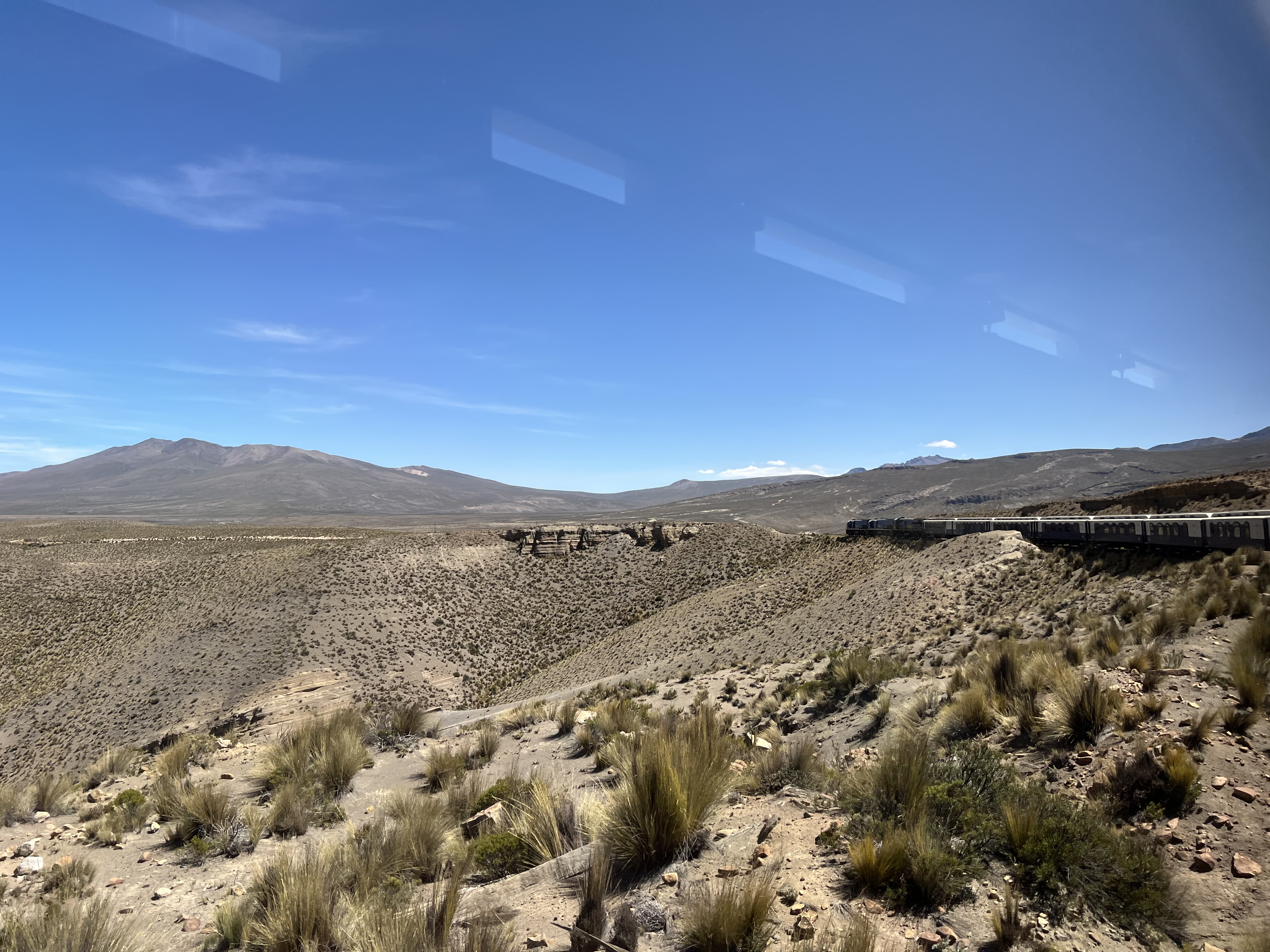 As we left Cusco, we notice how many people on the side of the rails were aware of the train coming through and were excited to see it. Some even took photos! This was basically the first running of the train for a few years and it runs across the Peruvian highlands into the Altiplano. It is the most extensive high plateau outside Tibet This is also where the Andes are the widest. The Altiplano area water goes to Lake Titicaca and never makes it to the Atlantic or the Pacific. The Andean Explorer runs all the way to Arequipa the white city and then you can do a return trip to Cusco if you so choose and of course pay for it! We however didn’t take the train to Arequipa but departed at an off the wall stop so we could enjoy the Colca Canyon with the Condors and then drove to Arequipa, overnight and then with a flight back to Cusco.