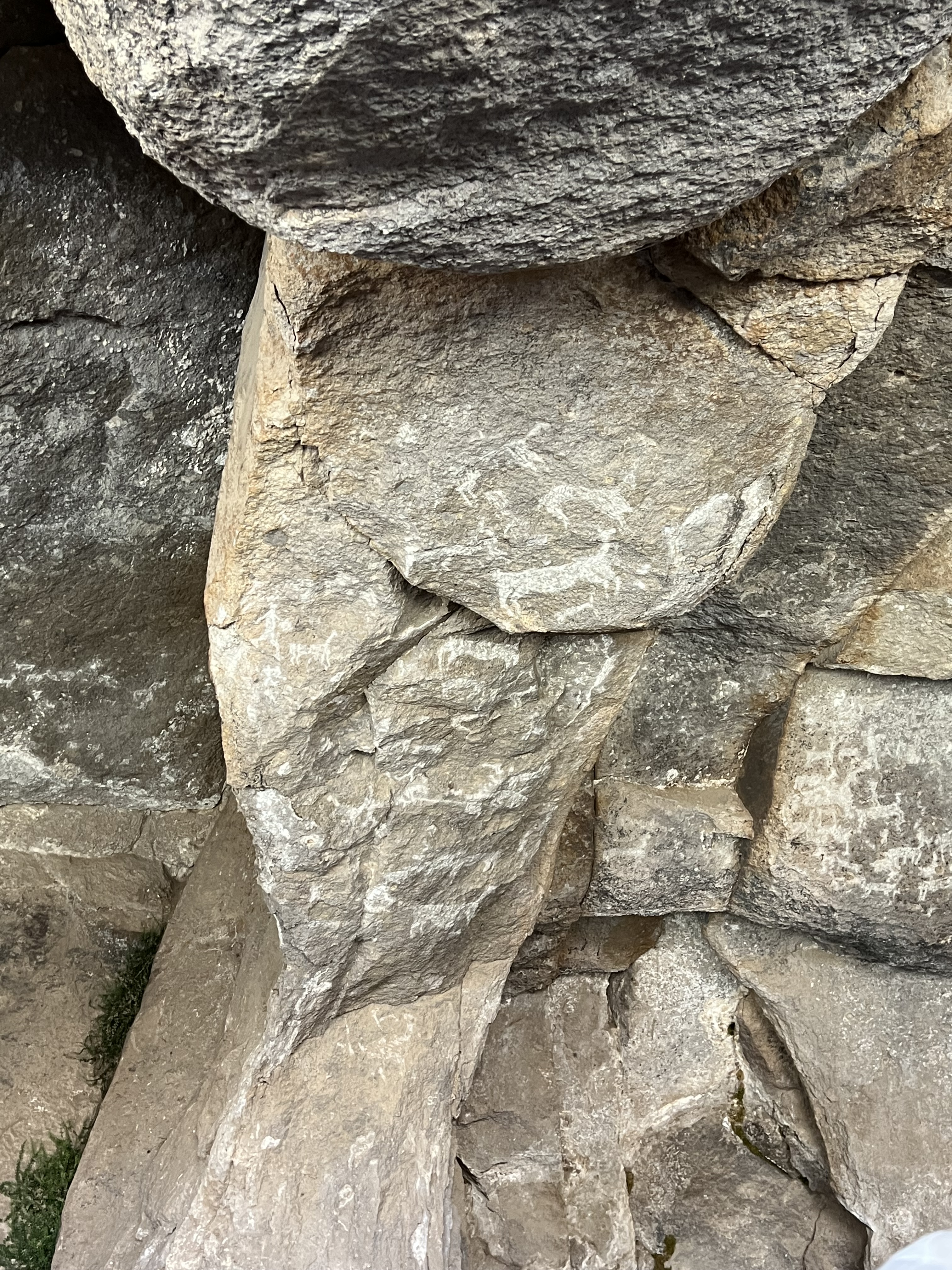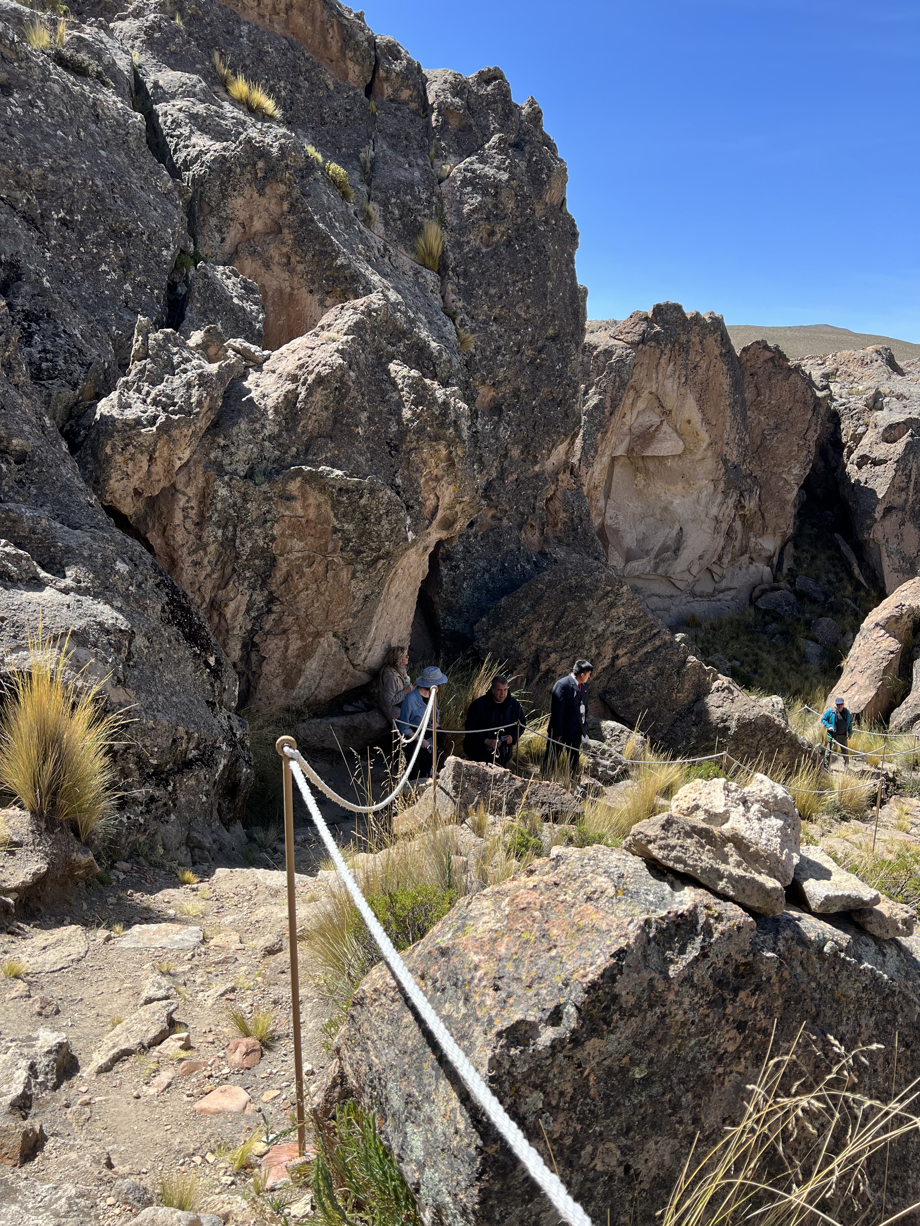 The train continued until we stopped at the Sumbay caves at marker 331. The caves are on the back slope of the Misti volcano at an altitude over 13, 500′. When the train stopped we slowly walked down as a group. Natives had met us to be able to hike down and we were also accompanied by dogs who like a pack had to fight as to who was boss. The Paleolithic cave has about 500 painted figures that can be viewed behind a chain link fence. Once again, the hike up and back was slow and deliberate seasoned with high consumption of water. The caves were discovered in 1968 and are now considered a Cultural Heritage of the Nation of Peru. The pictographs represent human figures, camelids, pumas and foxes. They were difficult to distinguish. The caves may also have been a religious center.