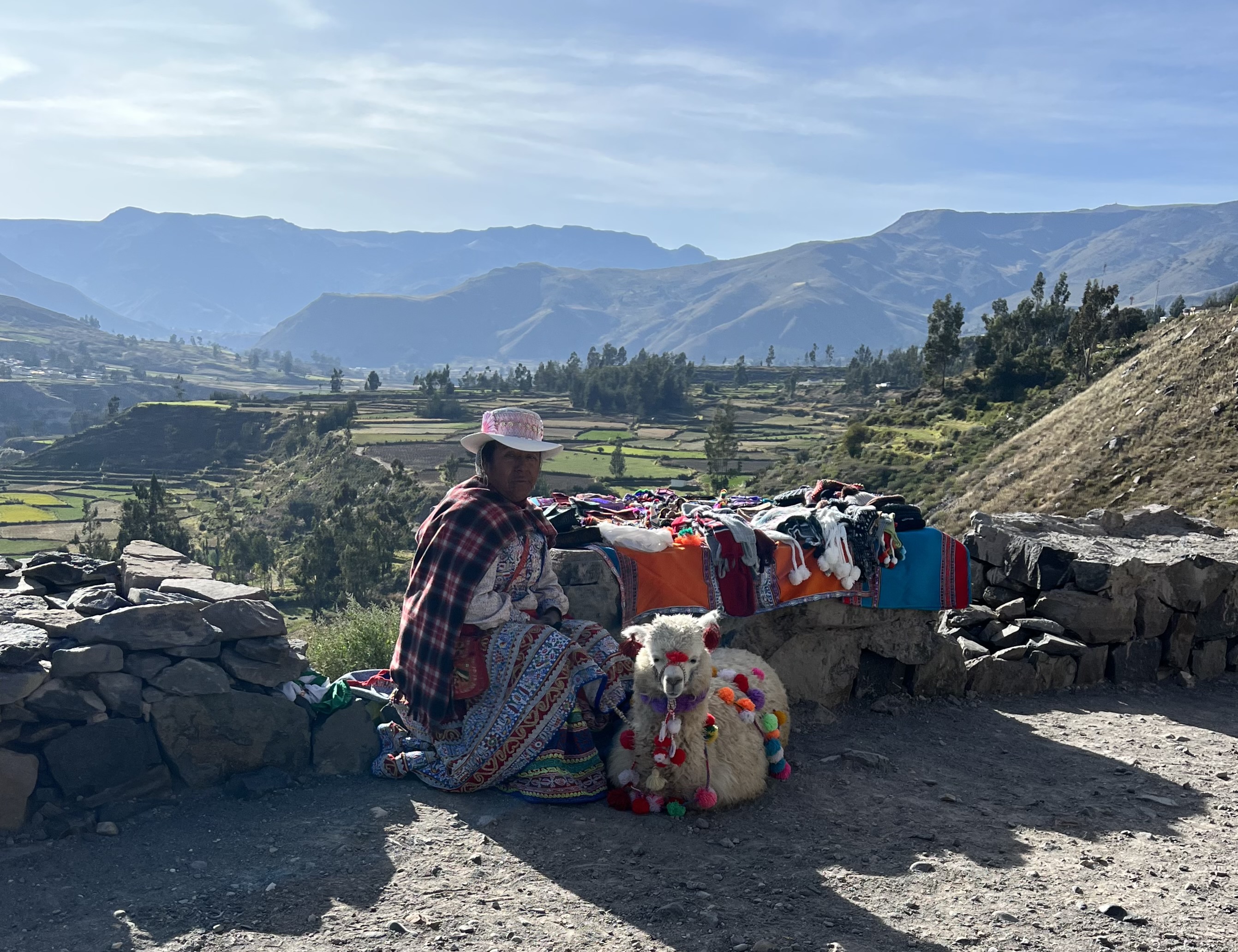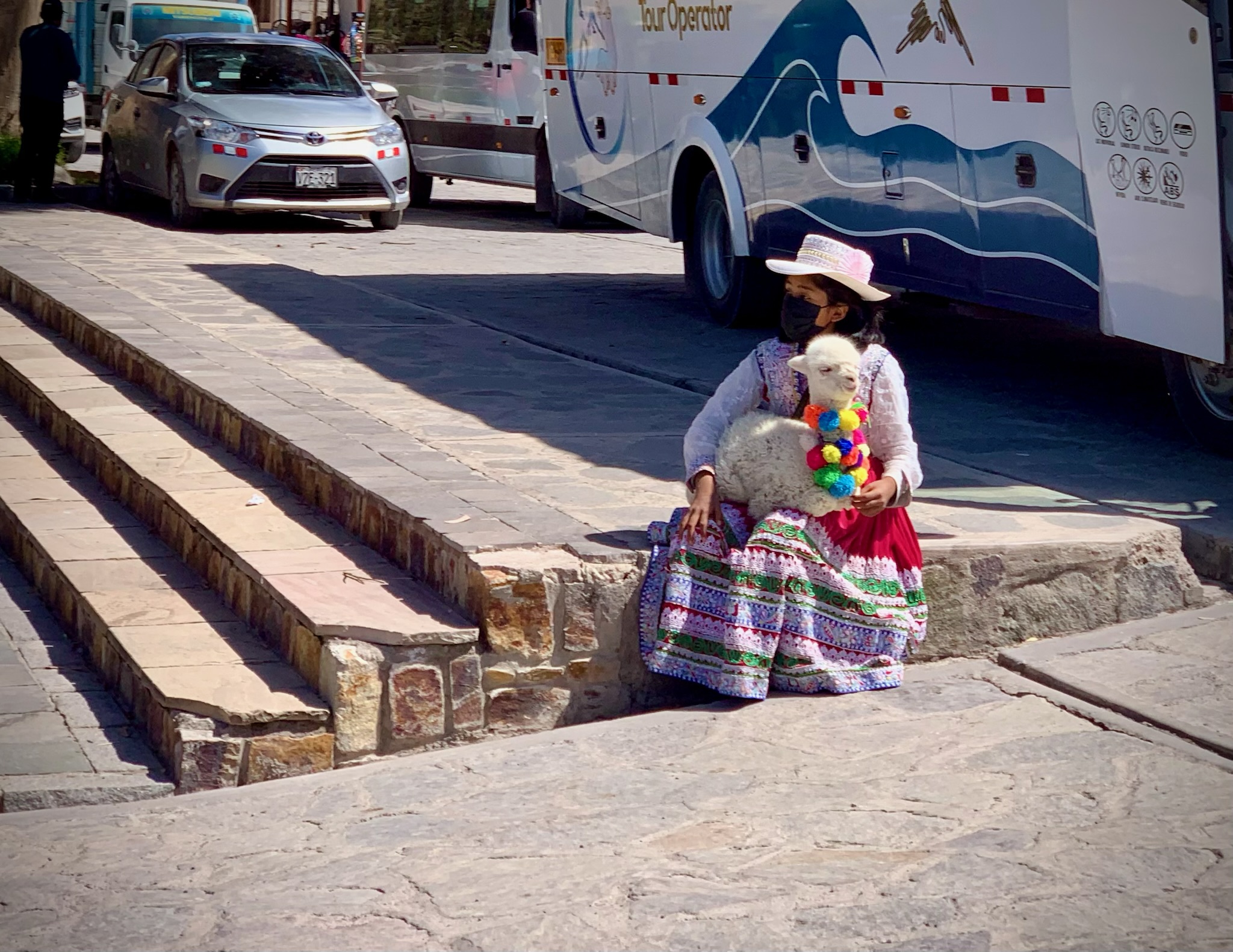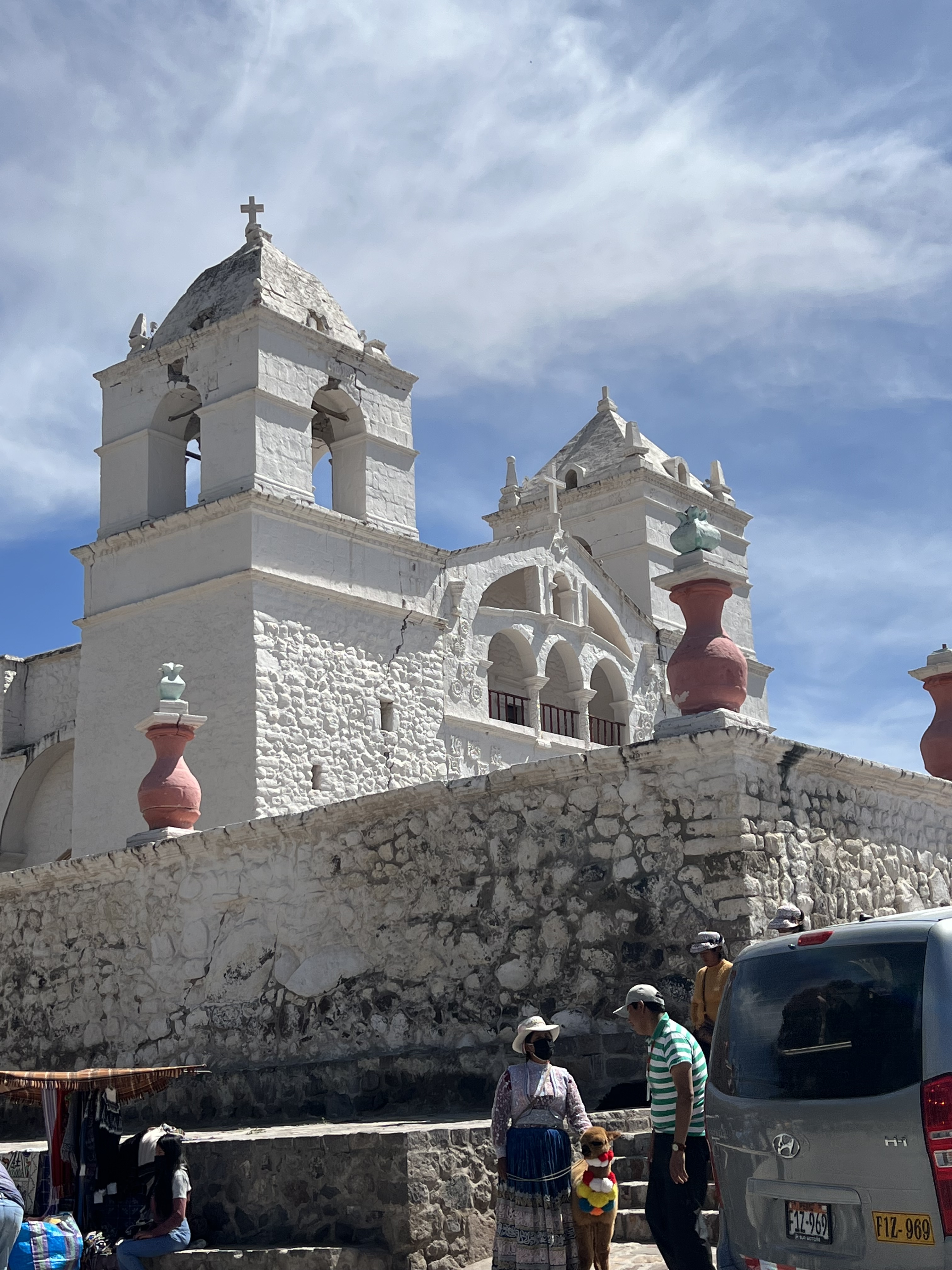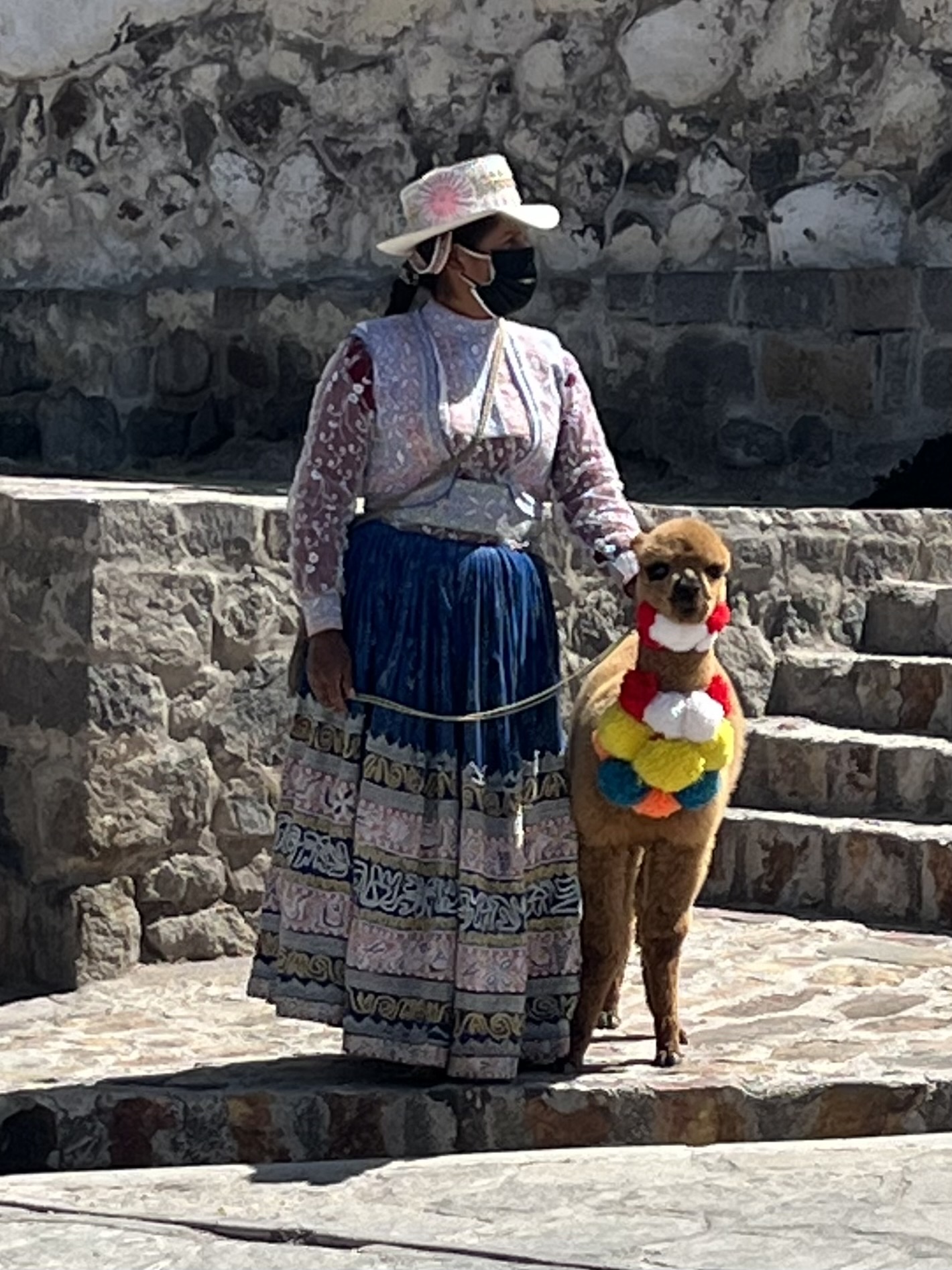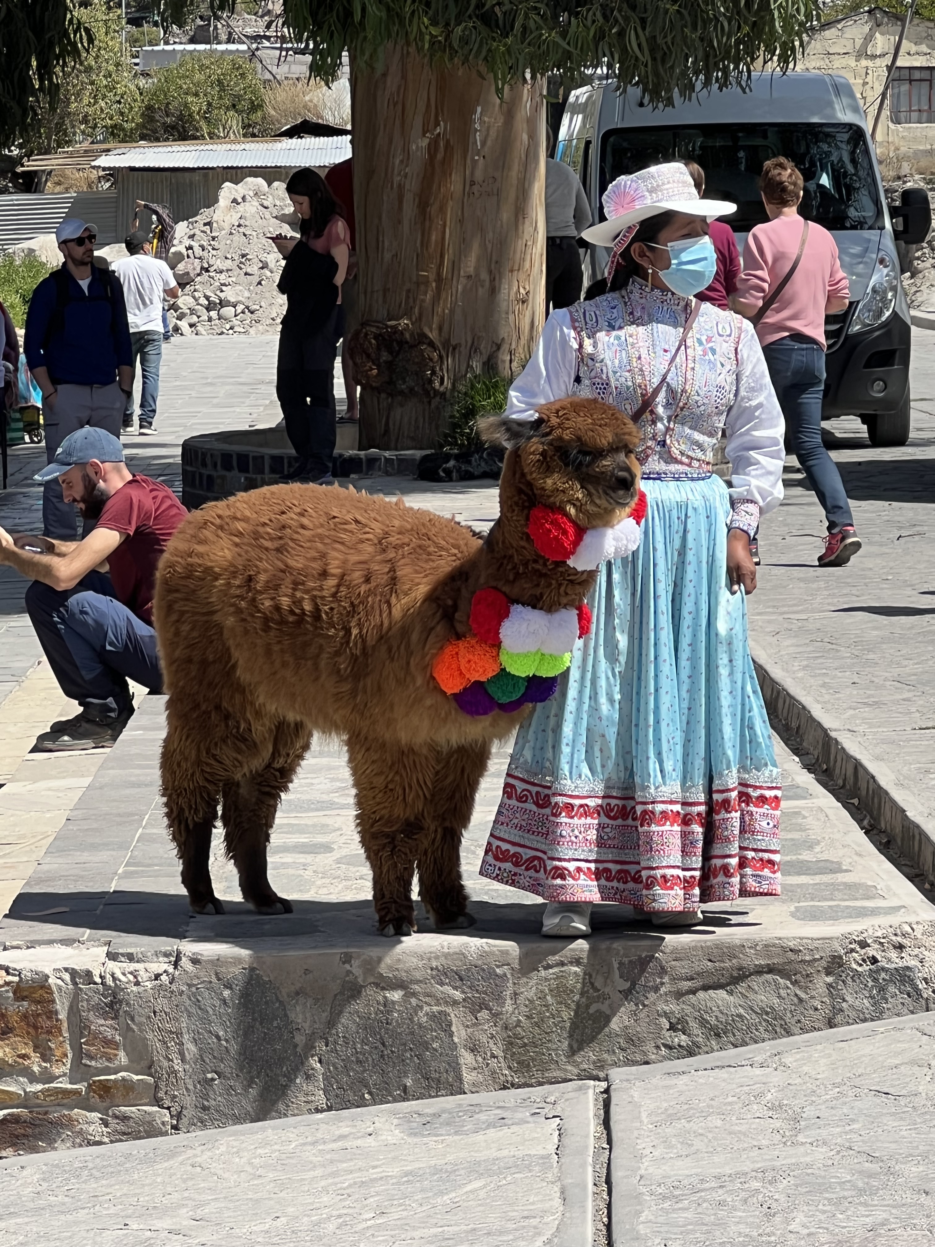 We stopped in Yanque on our way through and walked around the plaza. Color is everywhere! You can see why the Alpaca is so soft! Masks were required everywhere in Peru and everyone mostly wore them. We thought the colorful line of folks might have been for a Covid booster.