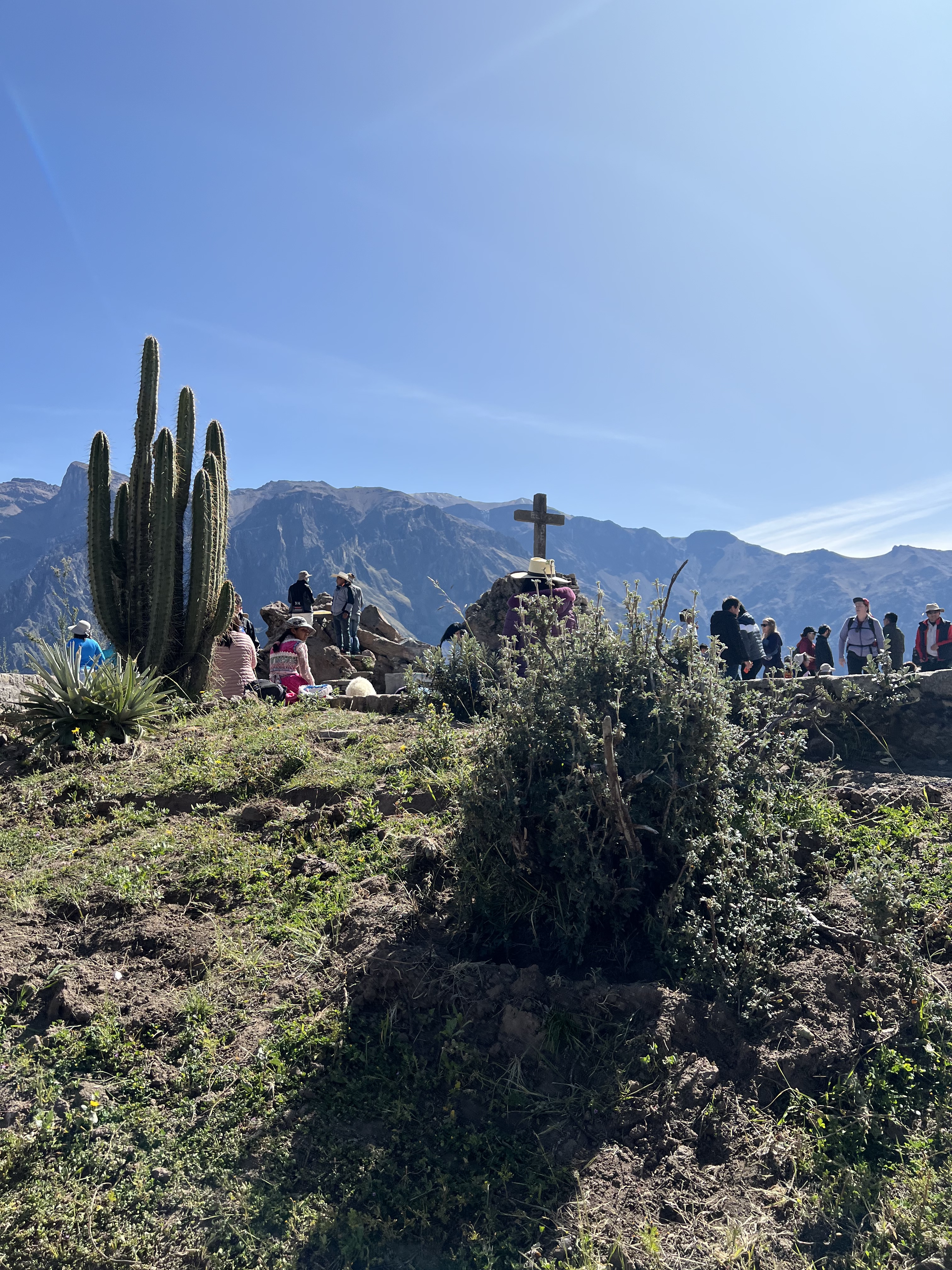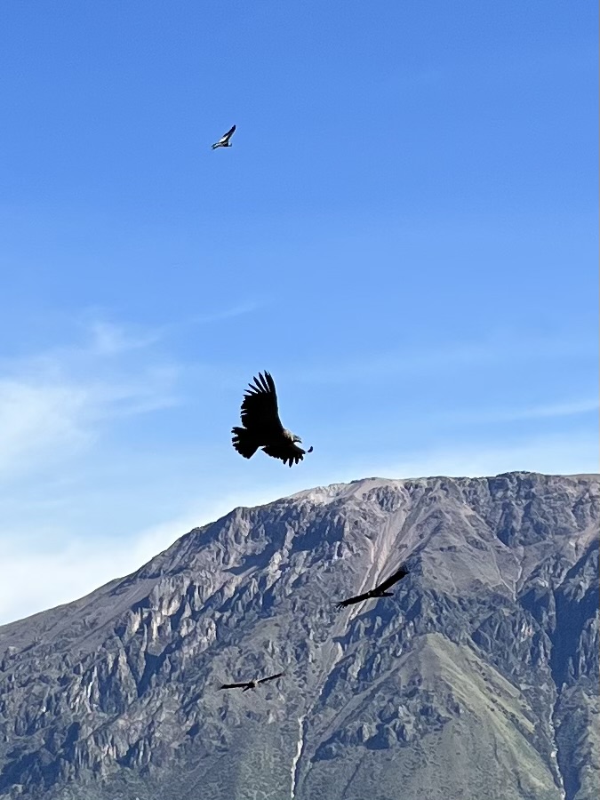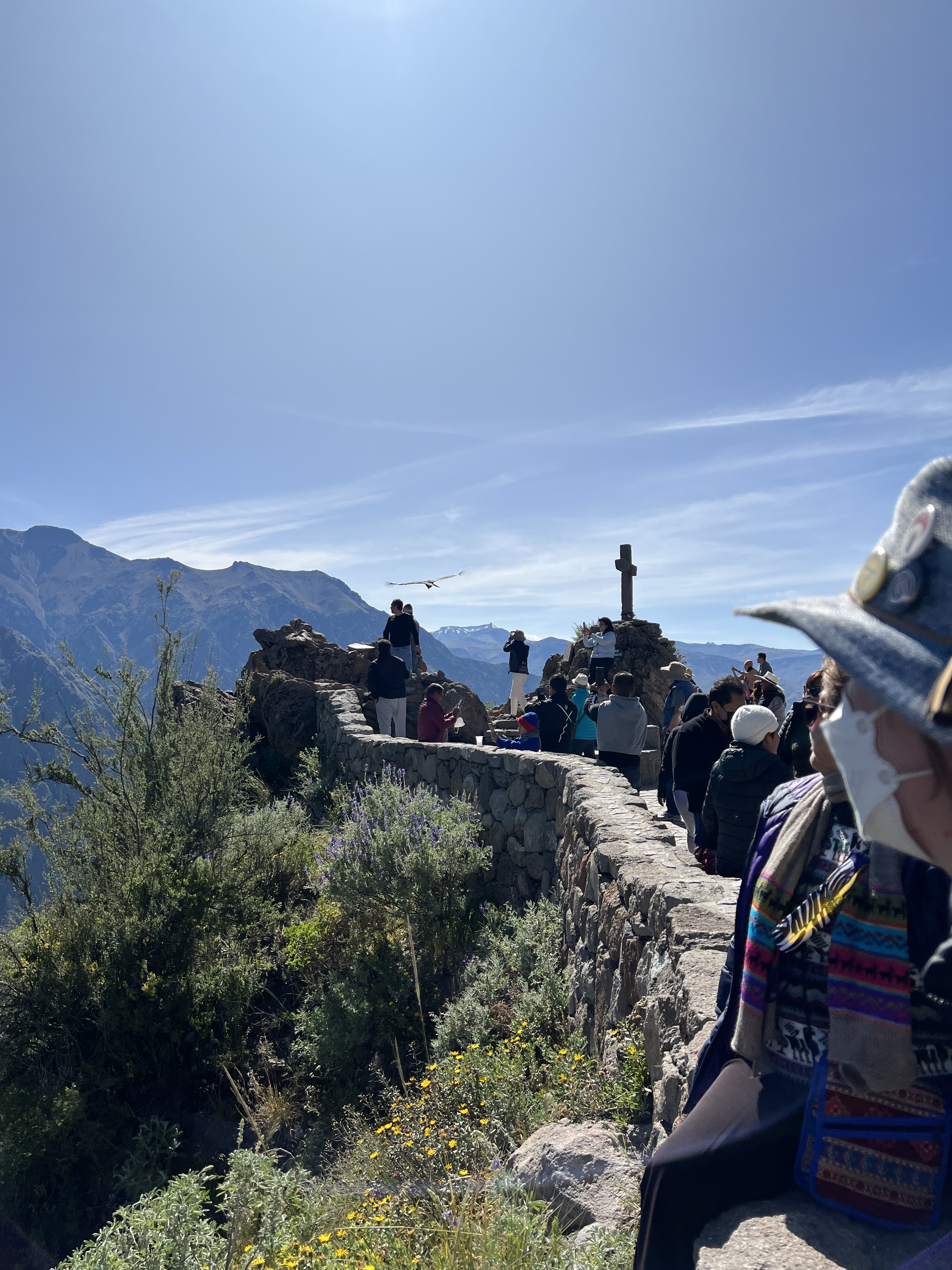 As you can imagine this is a place that attracts visitors from around the world. You can see the Condor Cross that is placed in the ground where folks gather. Catholics over the centuries have tried to put up crosses everywhere in South America and we were told in Cusco, many crosses were often removed by the locals indigenous people in the middle of the nights as they felt it was inappropriate since there were often place at Incan religious locations. This cross has remained and is a very notable tourist site. Amazing to see these massive Condors fly up and over those of us who were standing near the rock walls. I wish we had arrived a little earlier but at least the time we spent there was amazing.