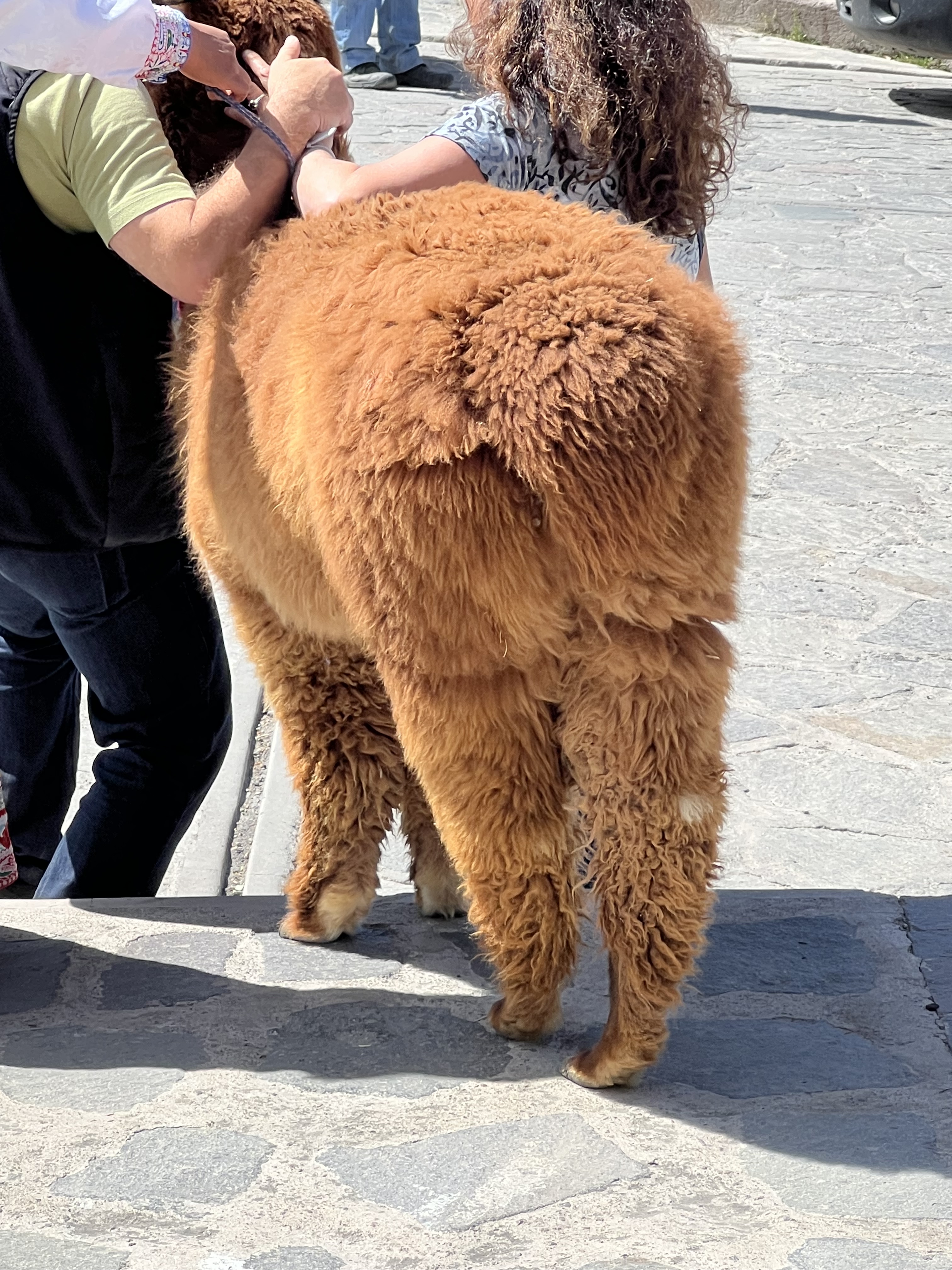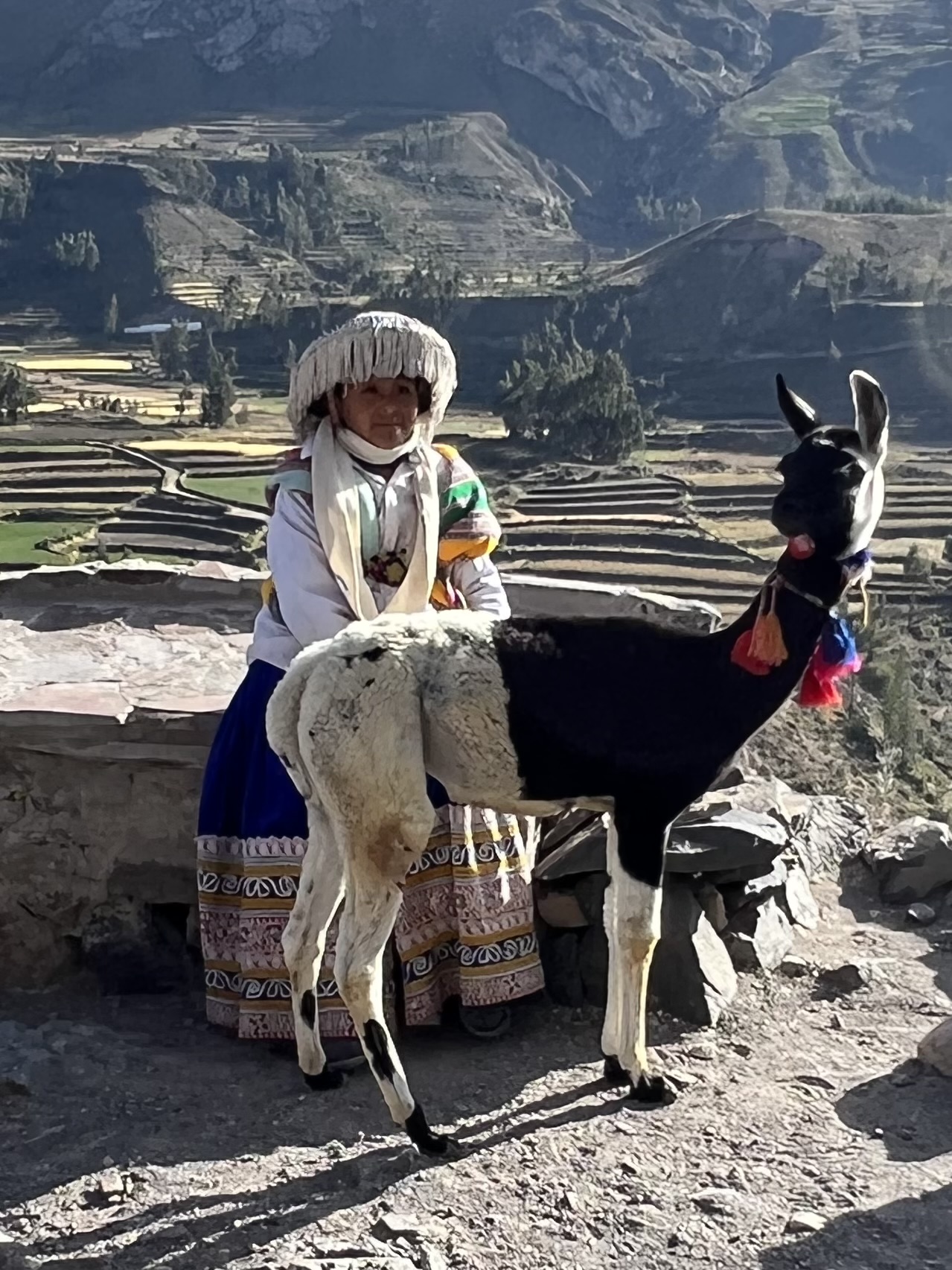 The drive up the canyon early in the morning took us past the incredible terraces that have been farmed before the Inca’s even arrived. The language here like the language in Cusco is Quechuan. There are of course many different dialects. I love the llama that seems to be half black and half white. There are always little things to look at and buy.
