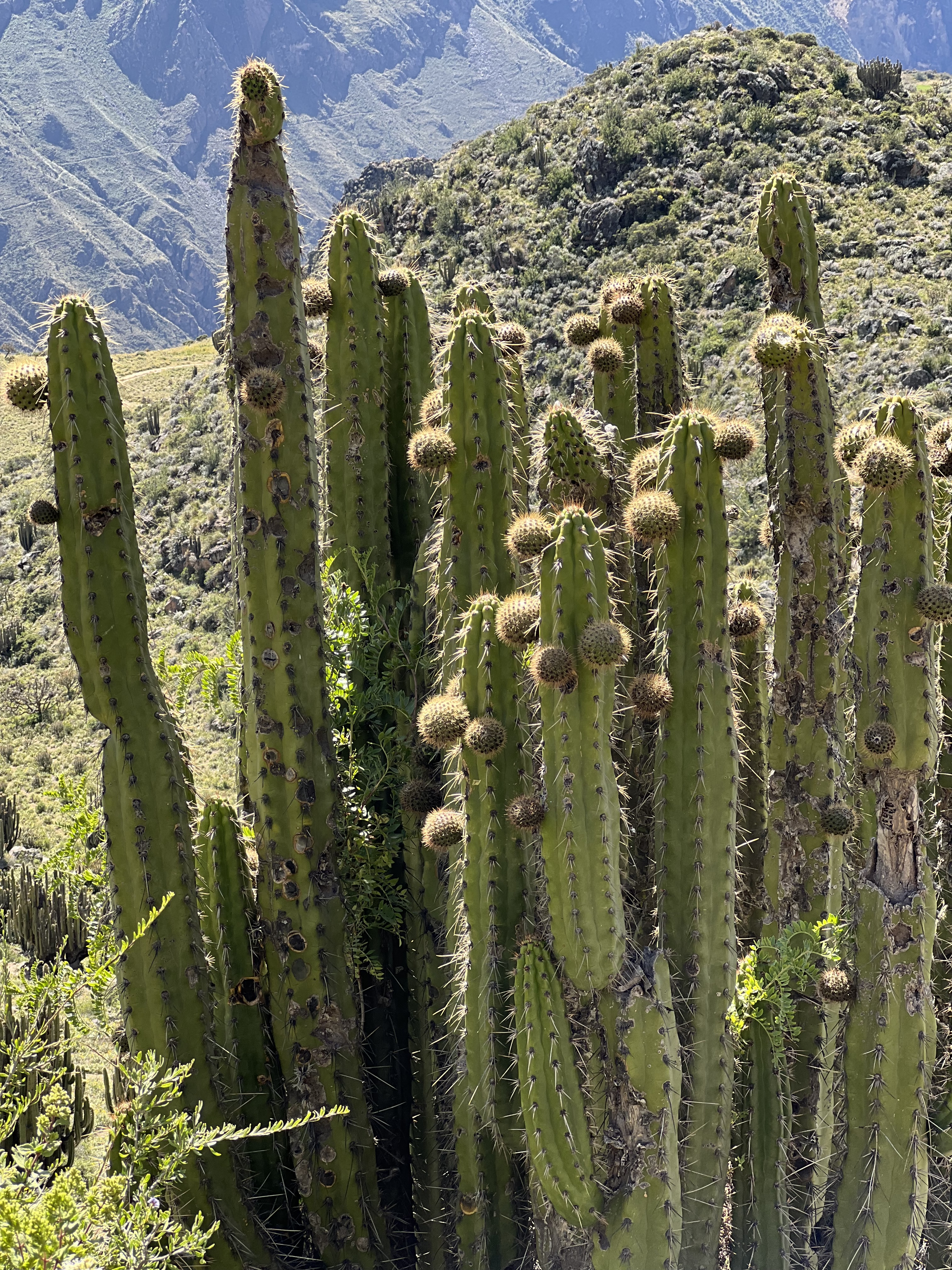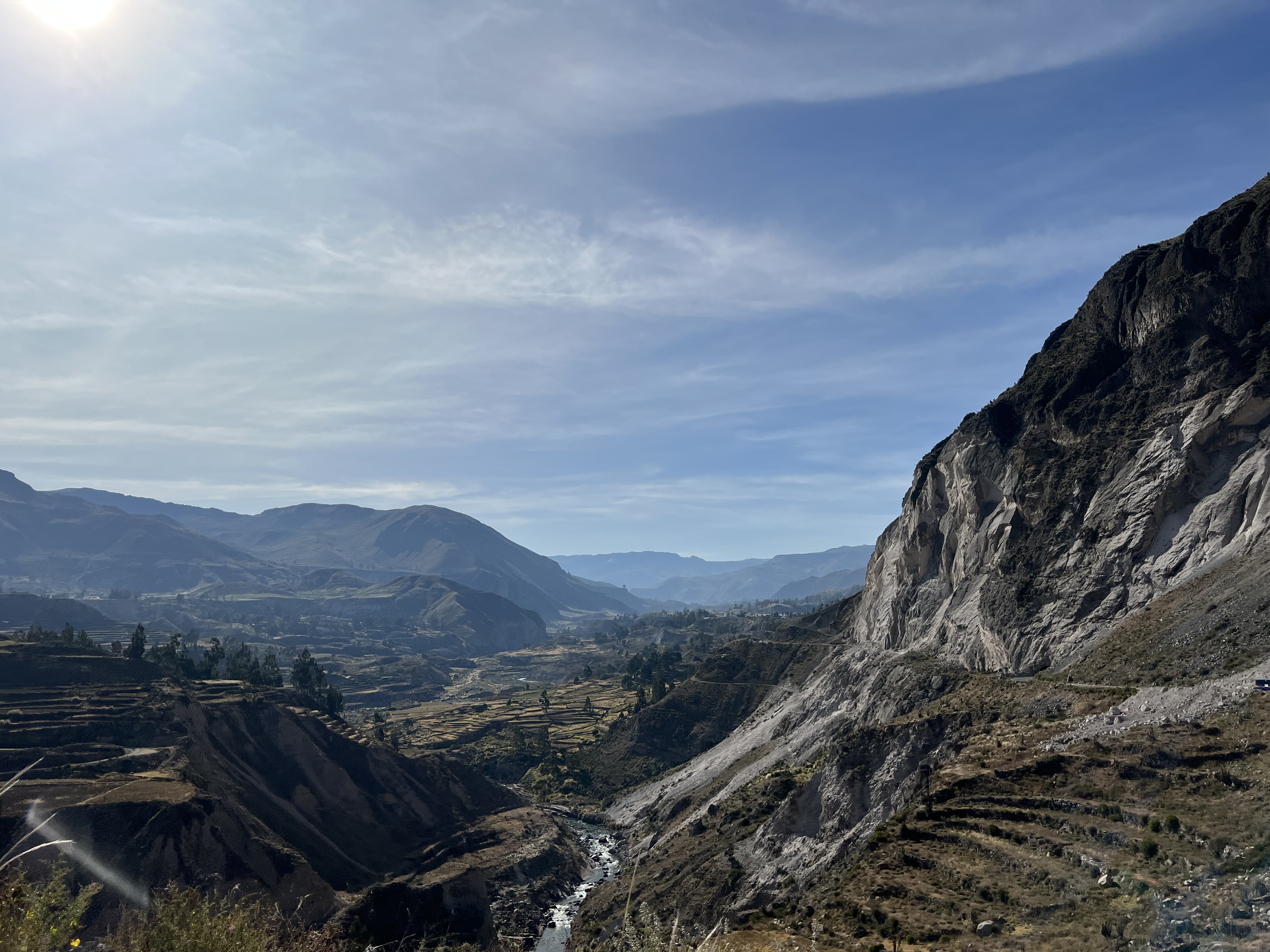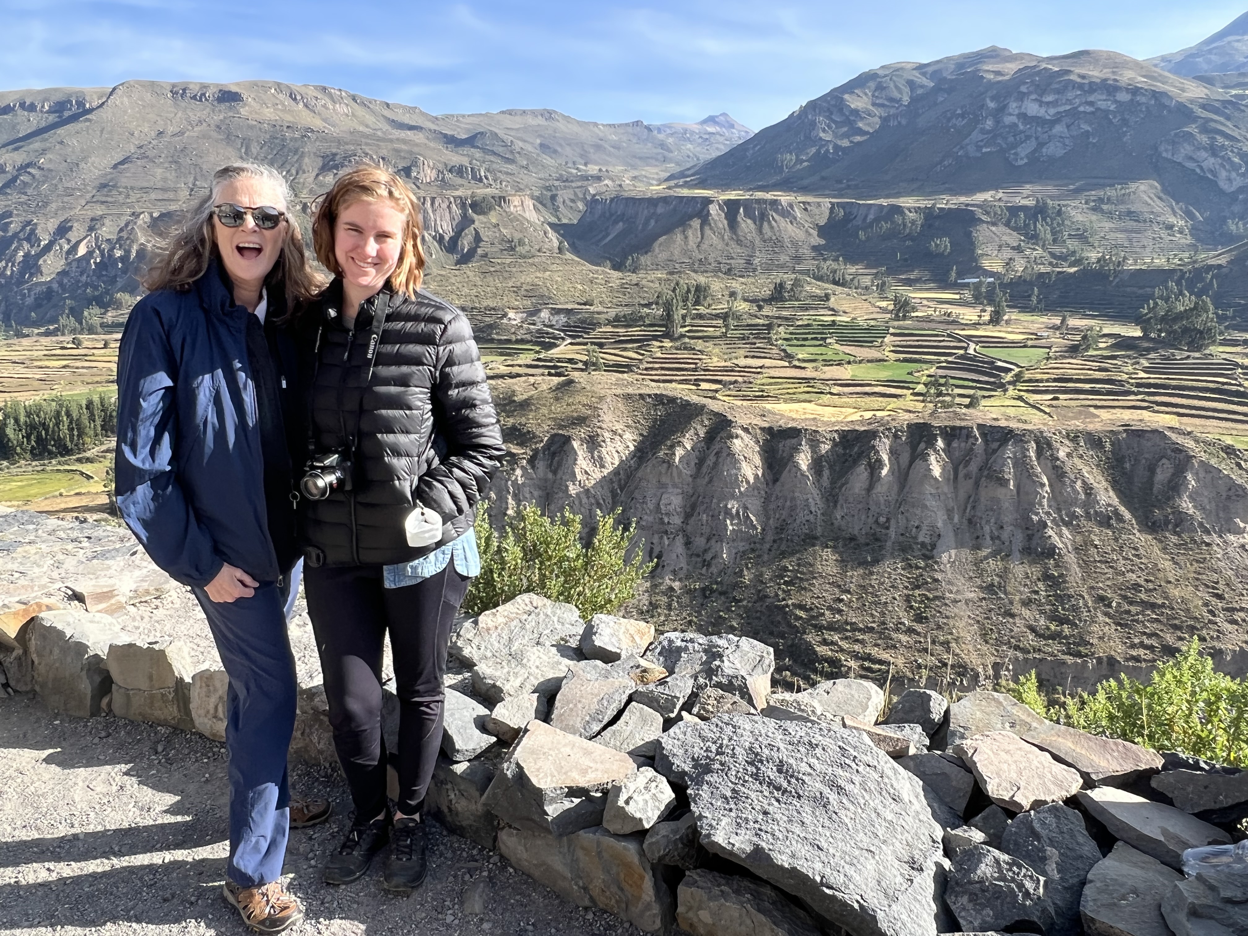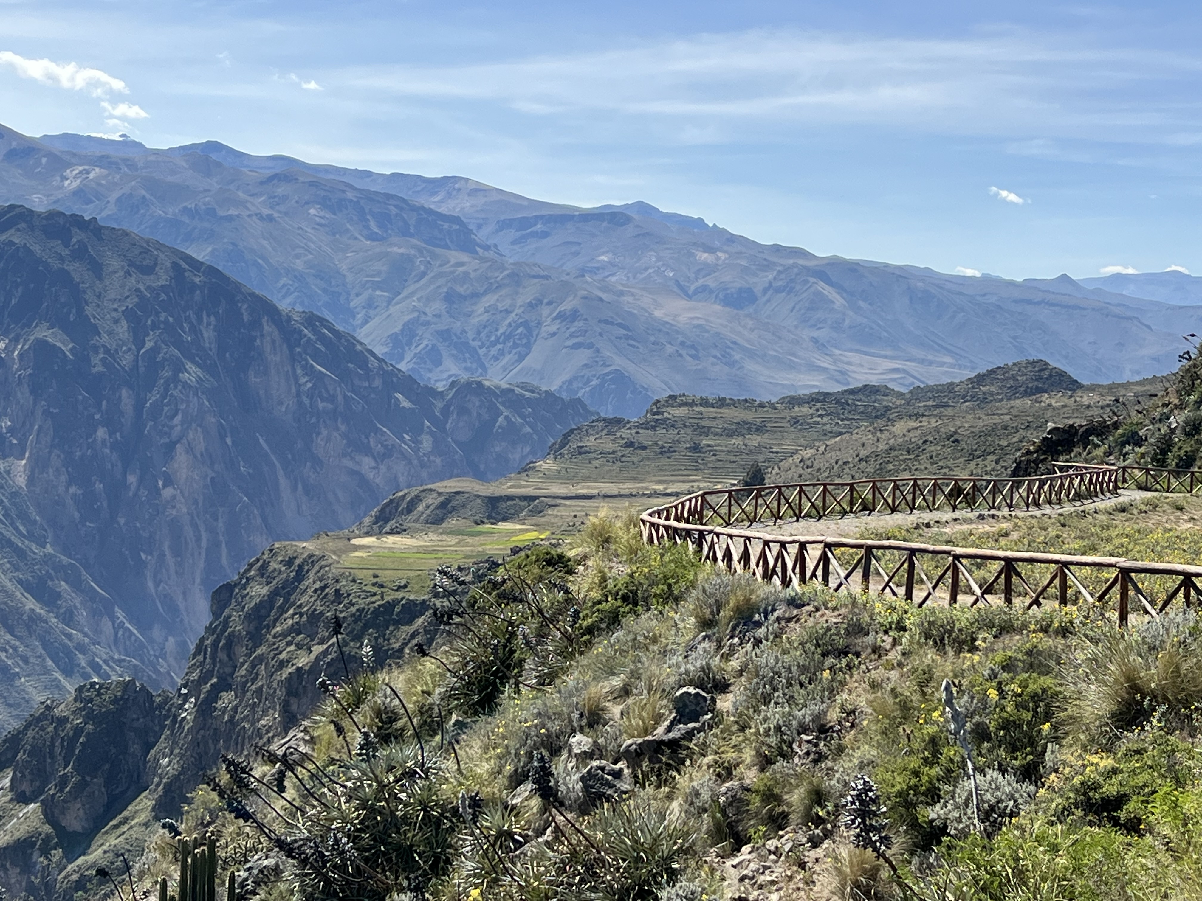 The Colca Canyon is one of the deepest canyons in the world along with Cotahuasi Canyon which is also in this area of Peru. Colca Canyon is only 43 miles long and one side is very steep and at an altitude of 13,640′ while the lower side is only 12,000′ and at a lesser slope reaching its height over a greater distance. The composition of the layers are mostly Cretaceous sedimentary rocks interspersed by much volcanic activity as they border the Valley of Volcanoes. But if you’ve been to our Grand Canyon you would never think it is smaller since ours takes your breath away. Its all about perspective.