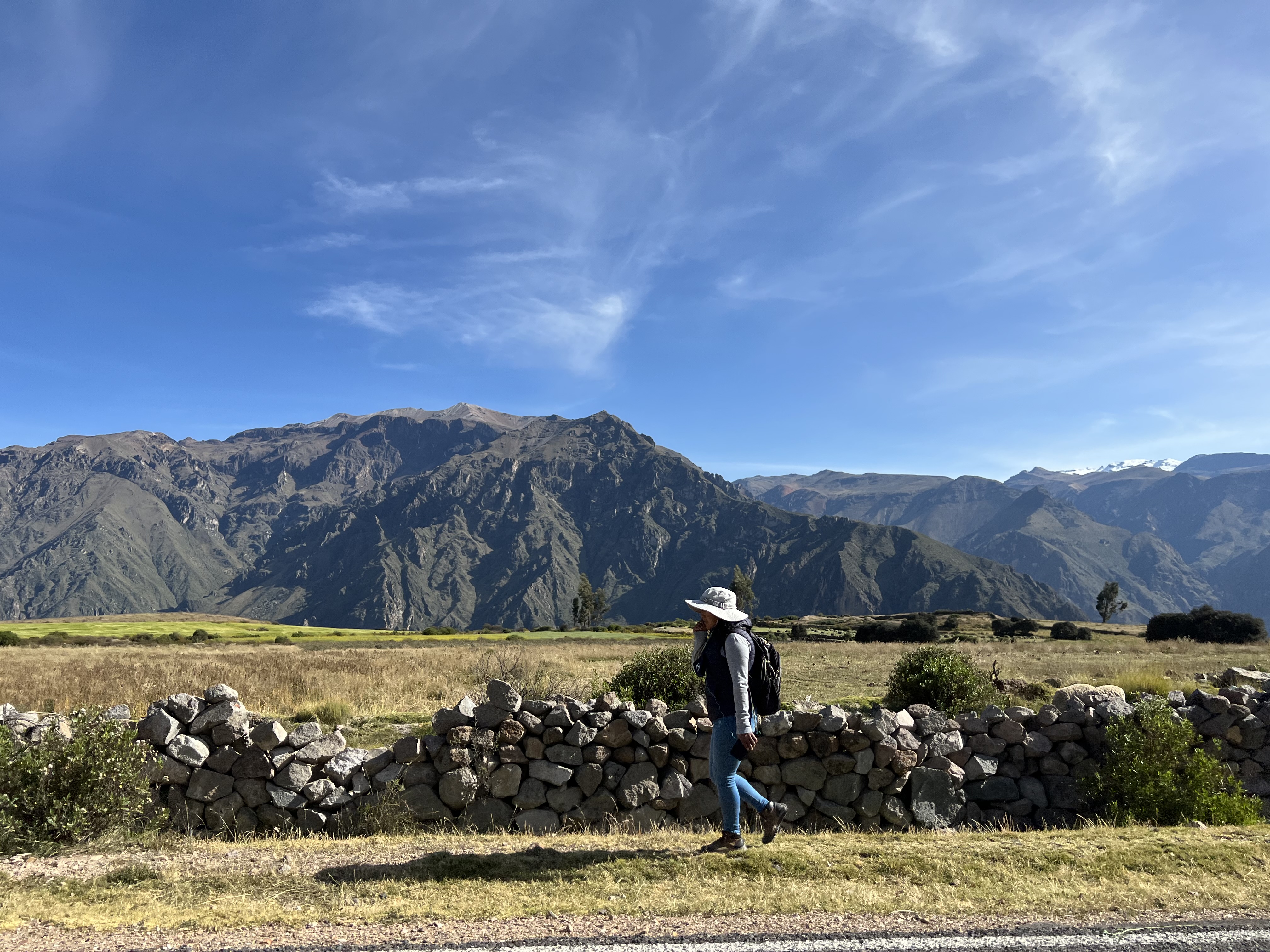 On the way back down the Colca Canyon to the valley, Gaudy took us to another area to walk out and see the canyon. For the most part we were the only people walking on the path. Not many birds but flowers, other birds and cactus’ that are used for food and beverages. I loved the Falla Geologica which meant watch out for falling rocks! We geologists love those signs!