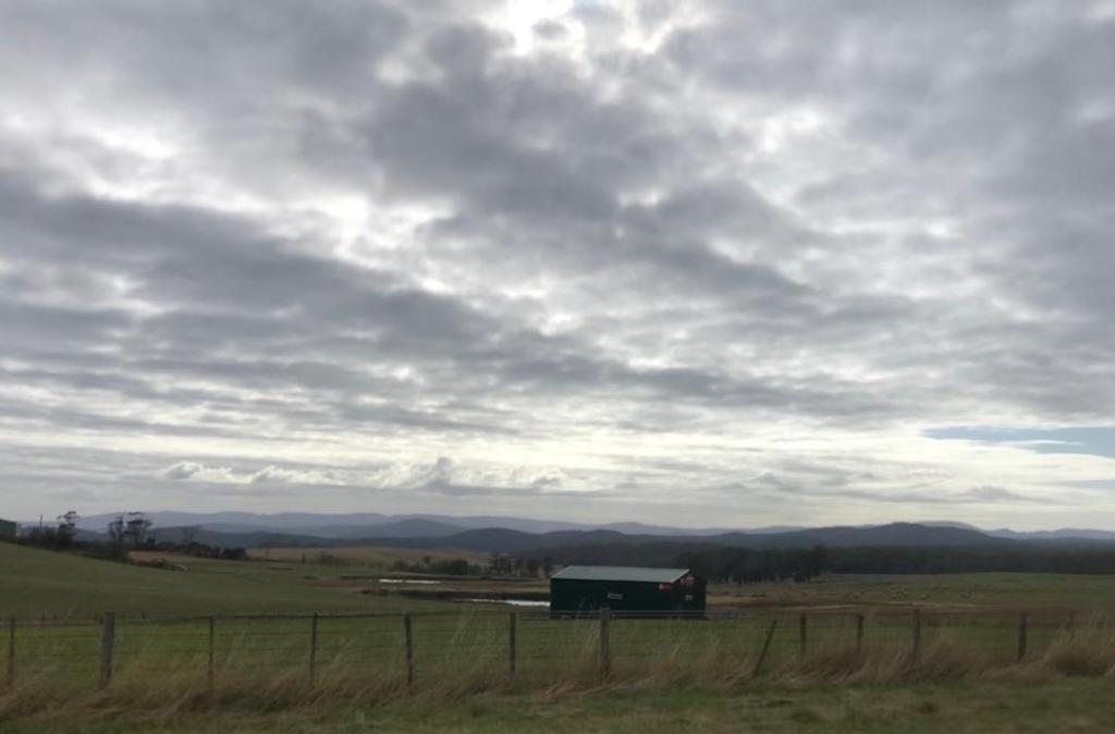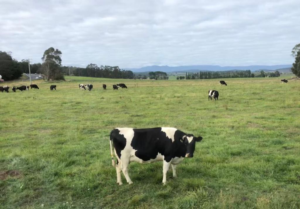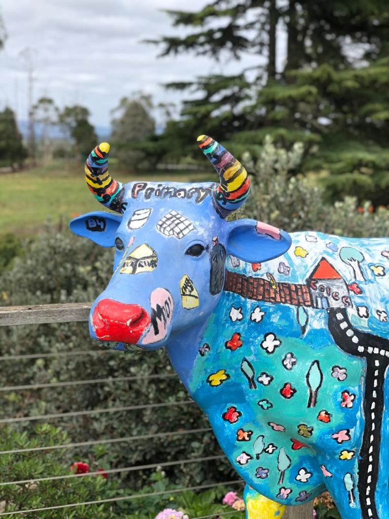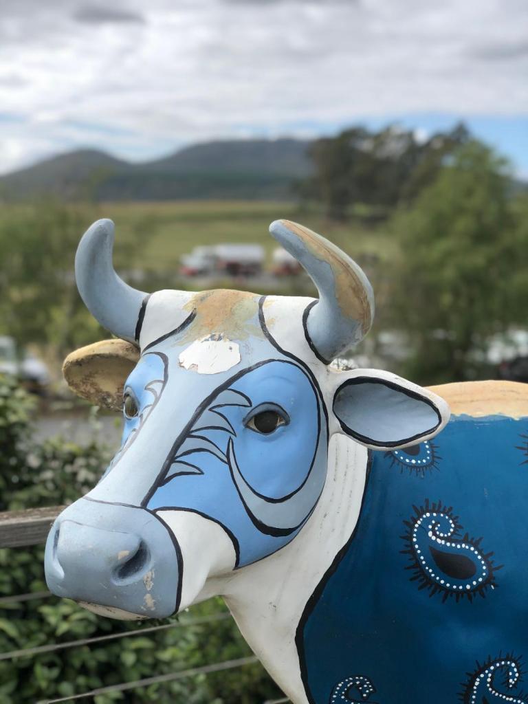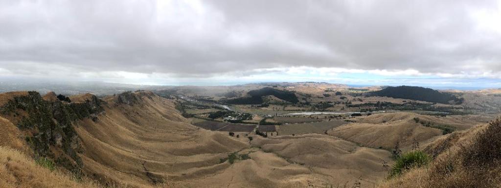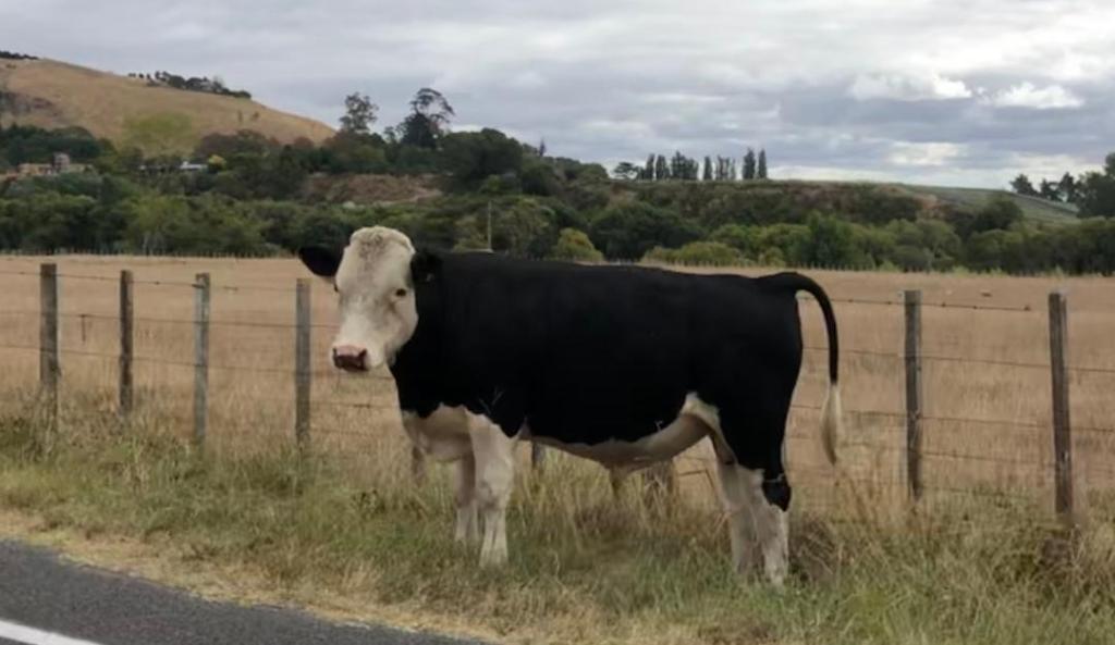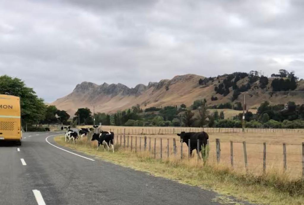 Craggy Range in the background with the cows, some hedges and Bessie being wary of us!