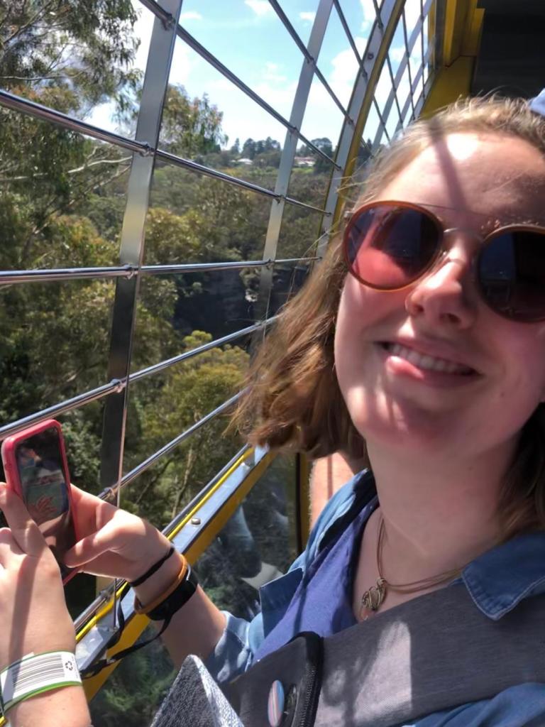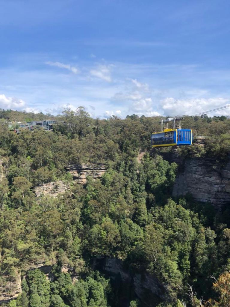 Scenic World which is private property in the Blue Mountains was a short ride away from Echo Point. We took the Scenic Skyway down to a previous area where they mined coal. We walked along a flat trail among the rain forest trees and palms, past coal mines to the old almost vertical train to ride back up to the top. Once we were vertically challenged back up the hill, we rode the Scenic Cableway across the forest. There were opaque floor tiles that would go clear as we rode across. The view of the forest whizzed past. We knew when we went back across we would stay on the uphill side and enjoy the waterfall views.