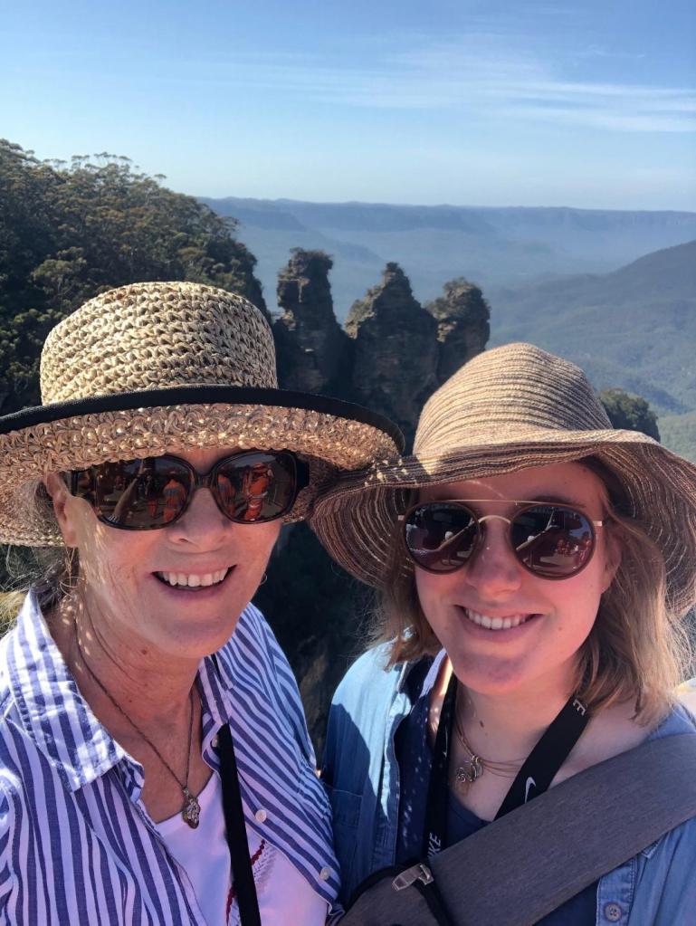 Three sisters a mom and a daughter in the old hats, a peak known as the orphan and Michael by a eucalyptus tree