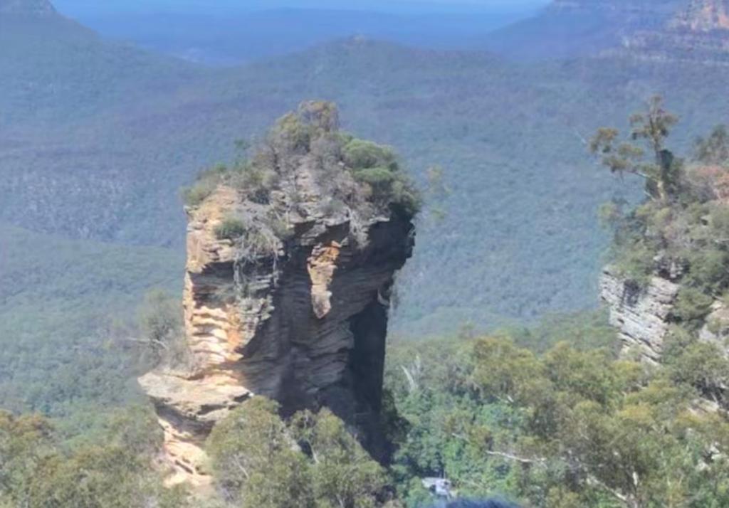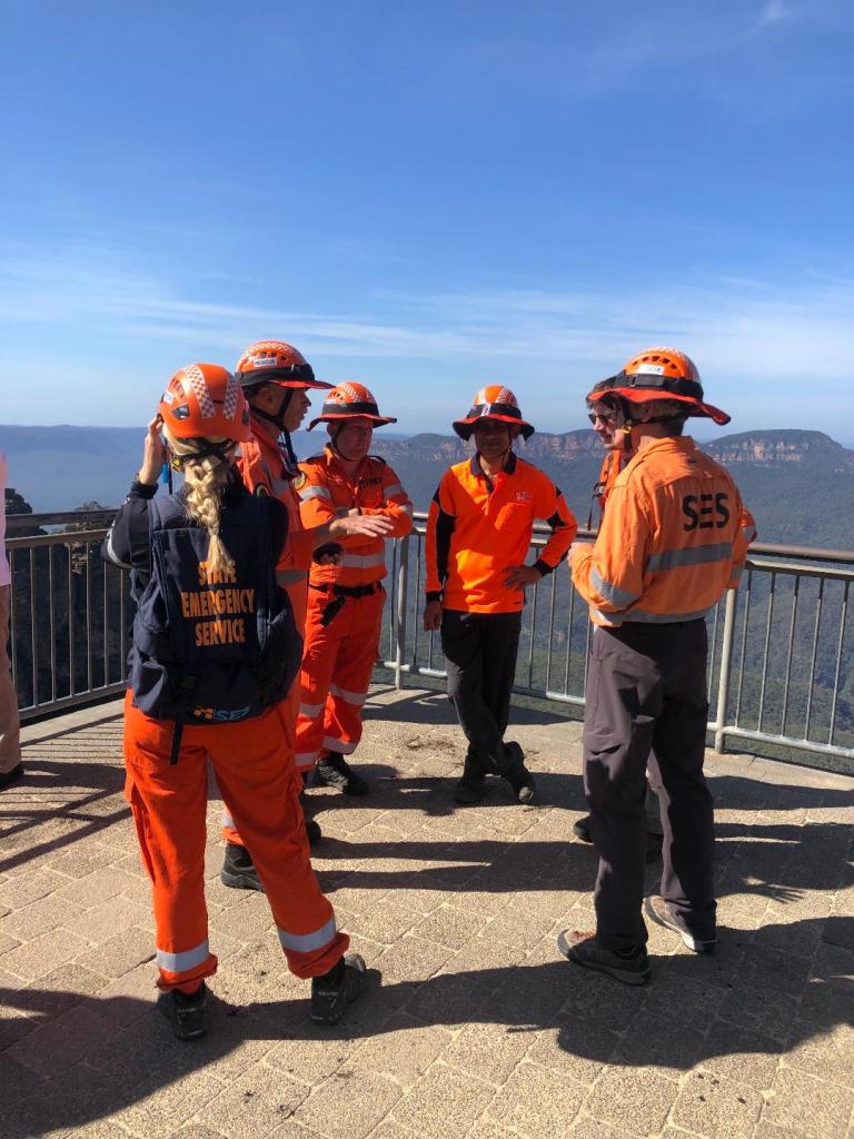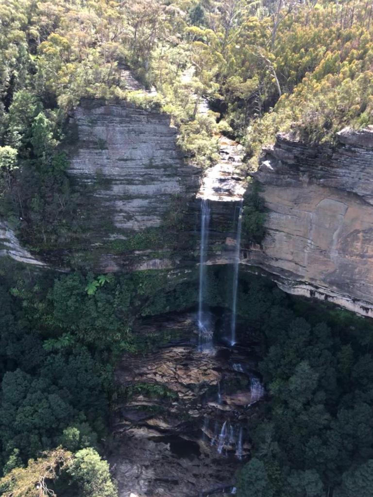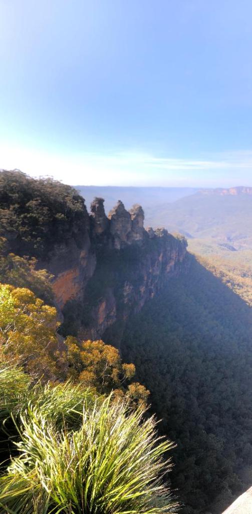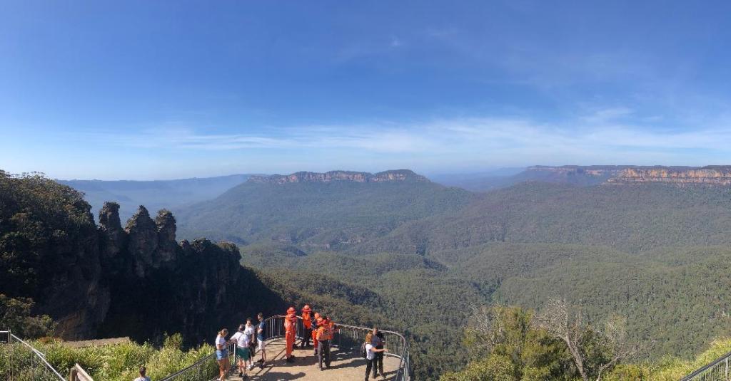 Our full day in Sydney we boarded a brand new beautiful luxury bus for the Blue Mountains National Park. We only had 18 people so we could spread out. Larkin enjoyed the two hour ride by napping stretched out on the back seat. When we got to Echo Point near Katoomba we found the loo and walked to this stunning view. The folks in orange are the State Emergency Services. It was clean up Australia day and they were vertical rescuers so they practiced rappelling down and picked up bags of trash that had blown off the vista. The three sisters are weathered sandstone peaks that were formed through thousands of years of erosion. The valley below is the Jamison Valley. The blue haze is the eucalyptus oil dispersed in the air – no pollution. Once again it was a very rare stunning day. Interesting that we were told our bus would have to move away while we enjoyed the views then they noticed there were no Chinese tourist due to the Corona virus so there was room to stay parked. Nice to have some nice things occur positively with this famous virus!