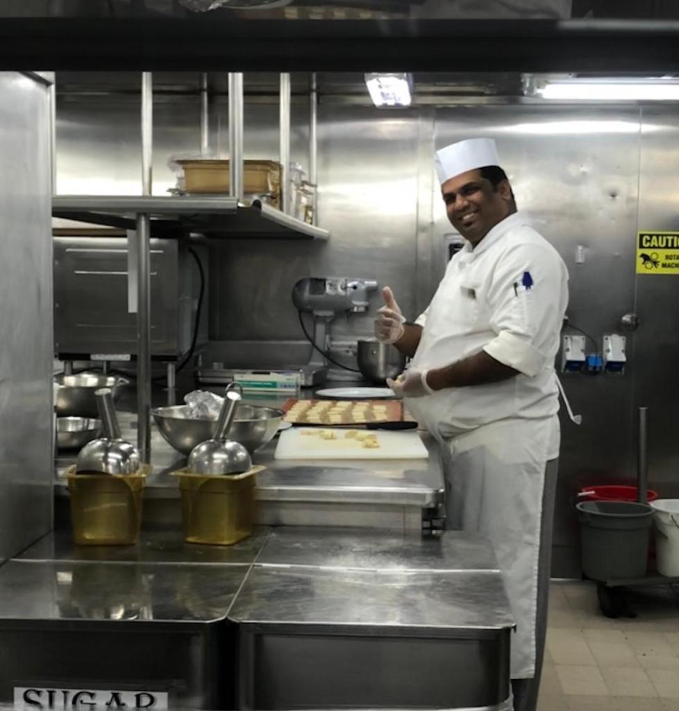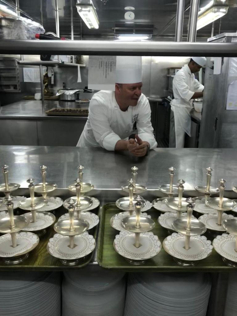 Executive chef Roland showed us around the kitchen with a couple of dozen fellow travelers. There are 63 chefs…and 24 hours of chefs doing pastries..From Canapes to trays of petit fours they know how to create, prepare and serve seemlessly in four different restaurants.