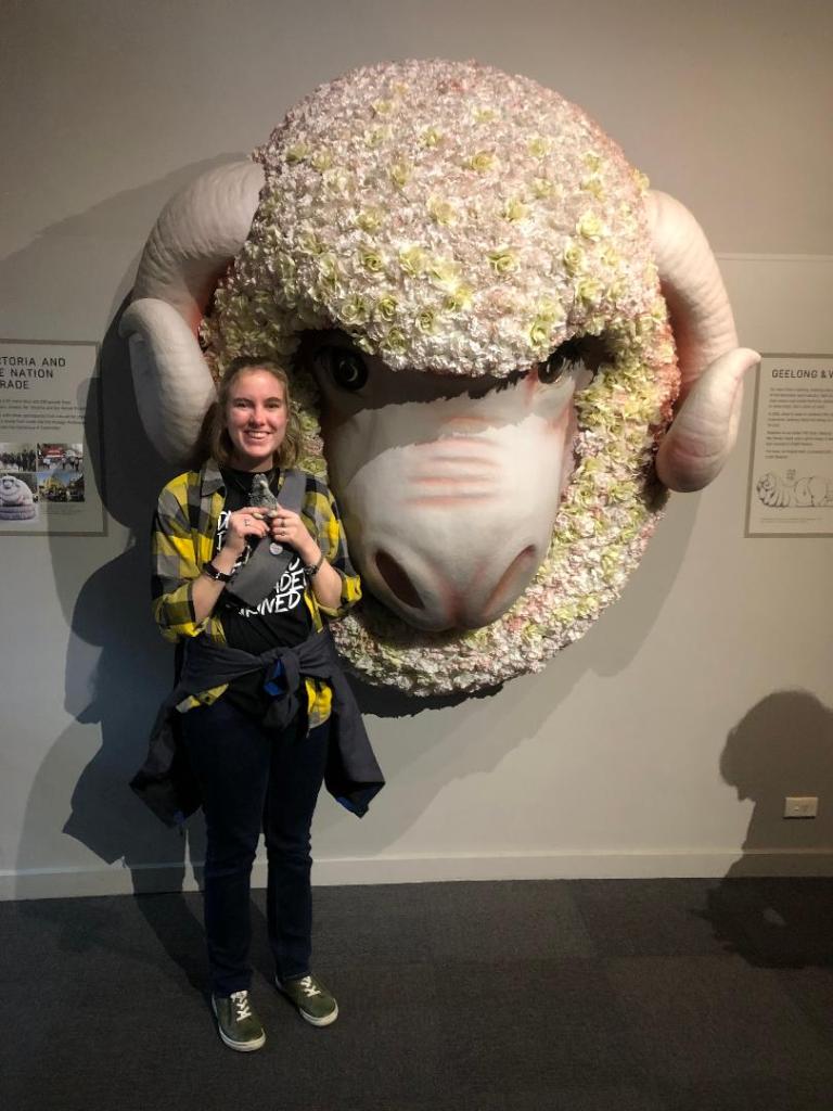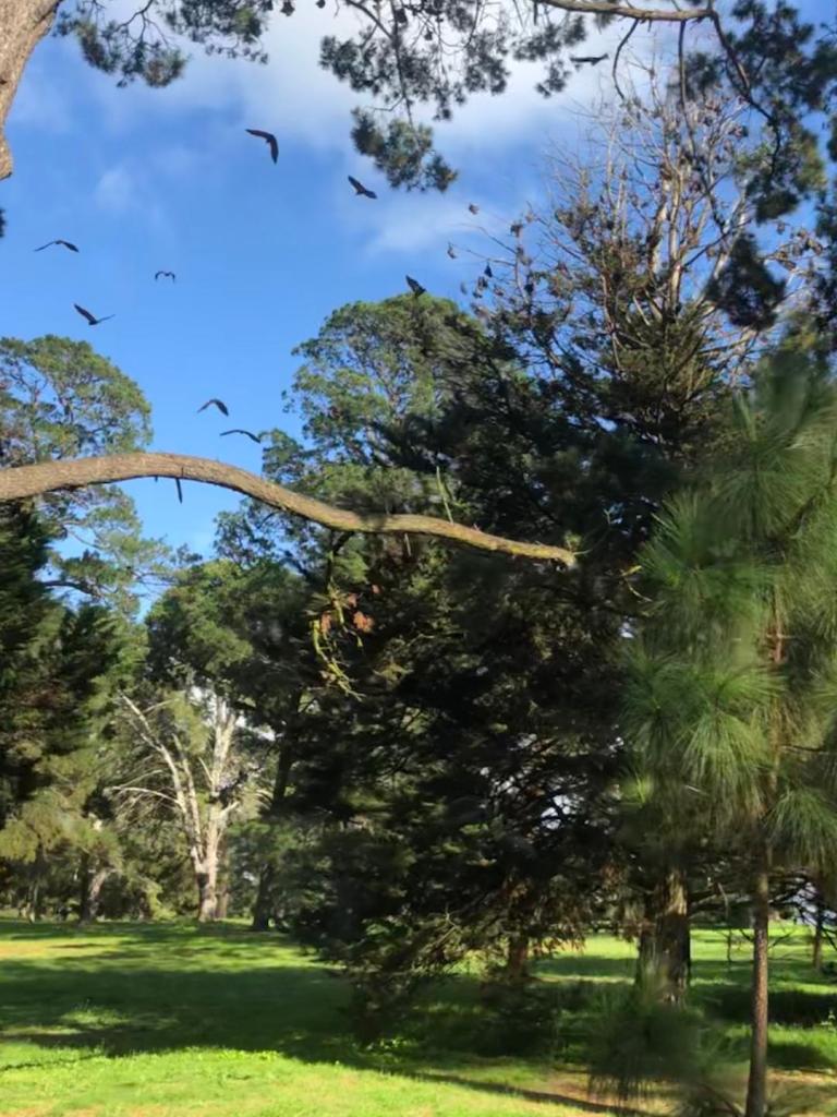 Larkin and I were on the bus for the Wool Museum that started with a drive around Geelong -the waterfront, through parks and the bat tree, schools, and nice homes. Apparently the bats were driven out of Melbourne with loud sounds and music and our driver said Geelong is known to accept every one and every thing. Hence the bats now live around Geelong. It was interesting to see an entire tree with upside down bats take off with the sound of the bus horn.