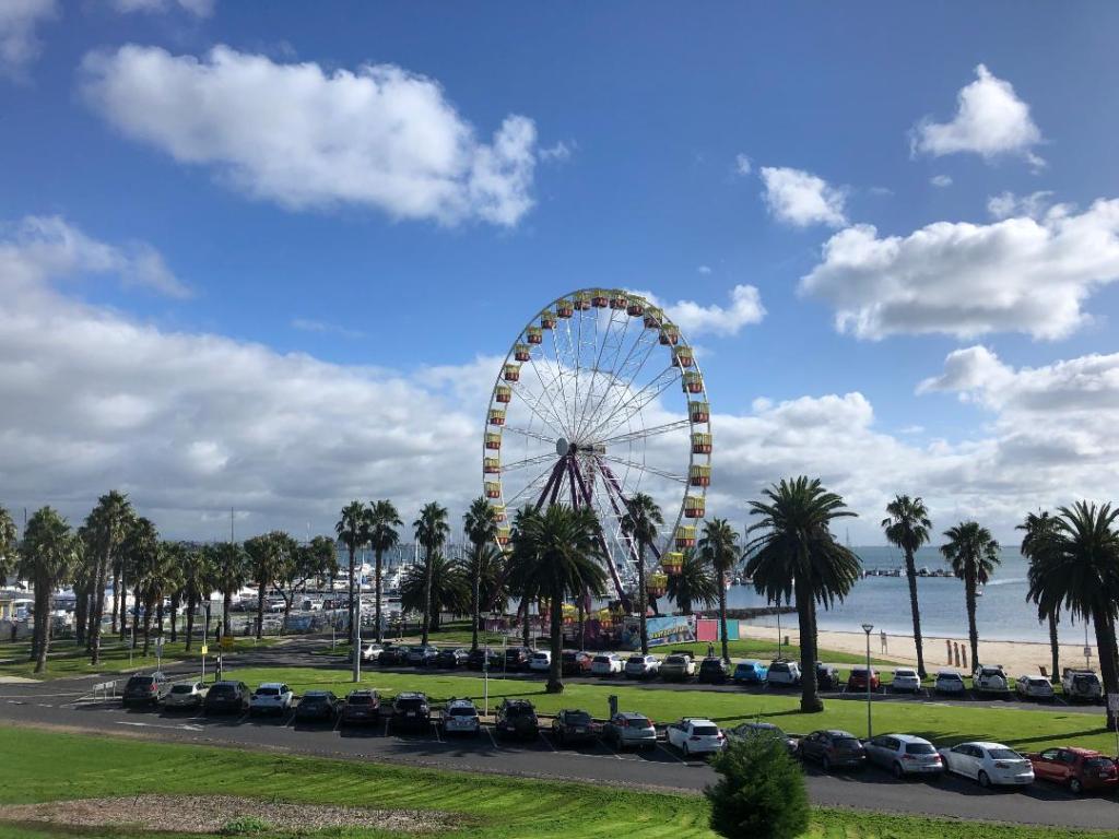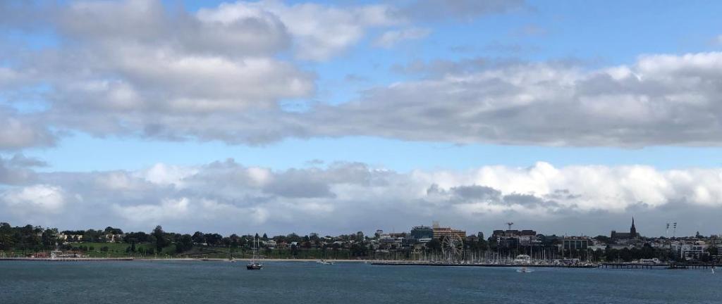 View of the harbor of Geelong from our anchorage– you can just see the sky wheel