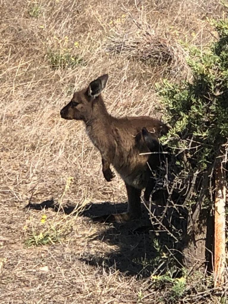 Kangaroos in the wild by the lighthouse under the trees as the day heated up. A Joey, a Dad and the Momwith the Joey