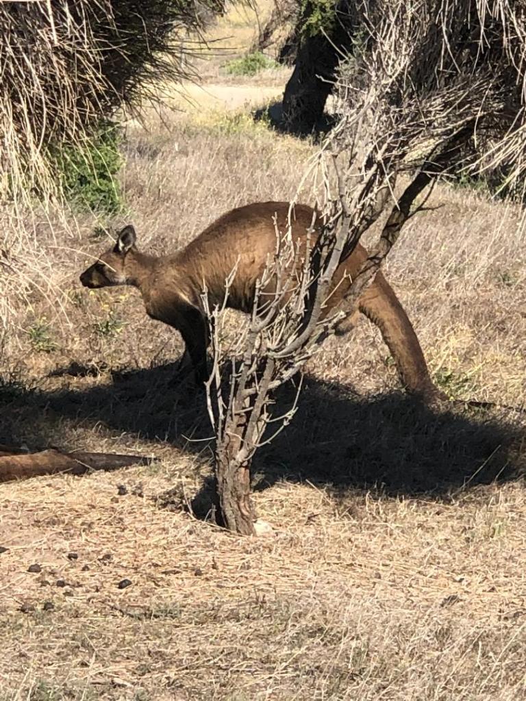 Our guide, one of the best so far told fabulous stories. He had two kangaroos in his front yard this morning foraging and hit one last night on his way home. …and yes he has a roo bar on his vehicle! Kangaroos remind me of our white tailed deer at home at the beach. Pests. Visitors to Dillon Beach love to take their photo – oh aren’t they cute. We hate to hit them with our car since we’d ruin it. Maybe I need a roo bar?