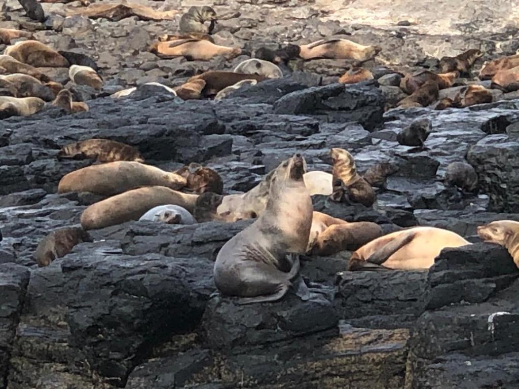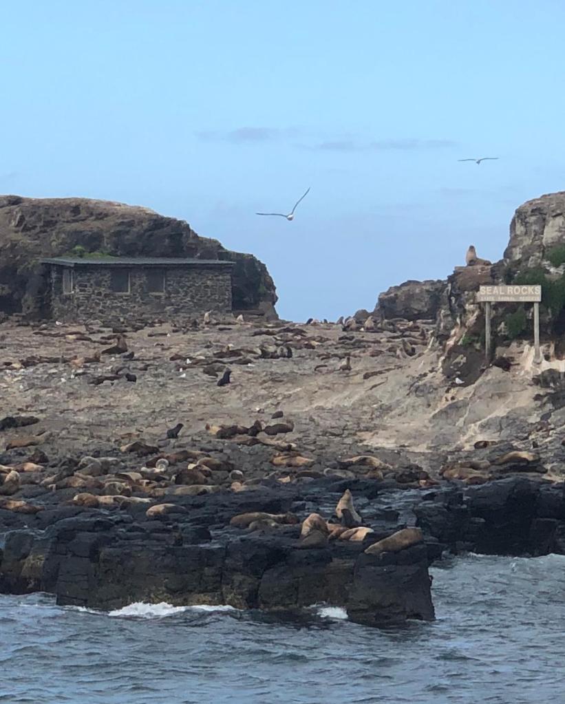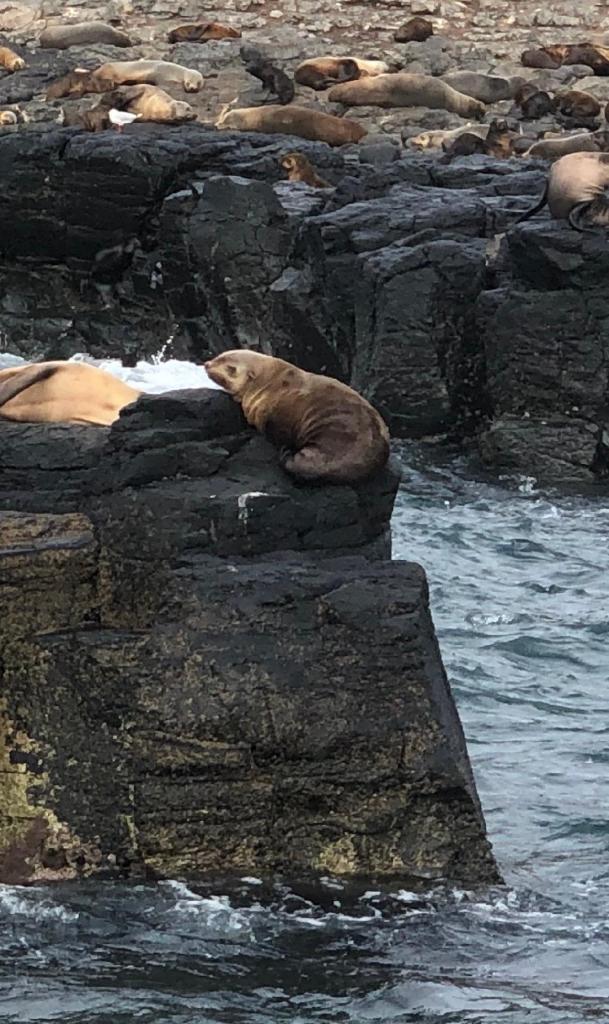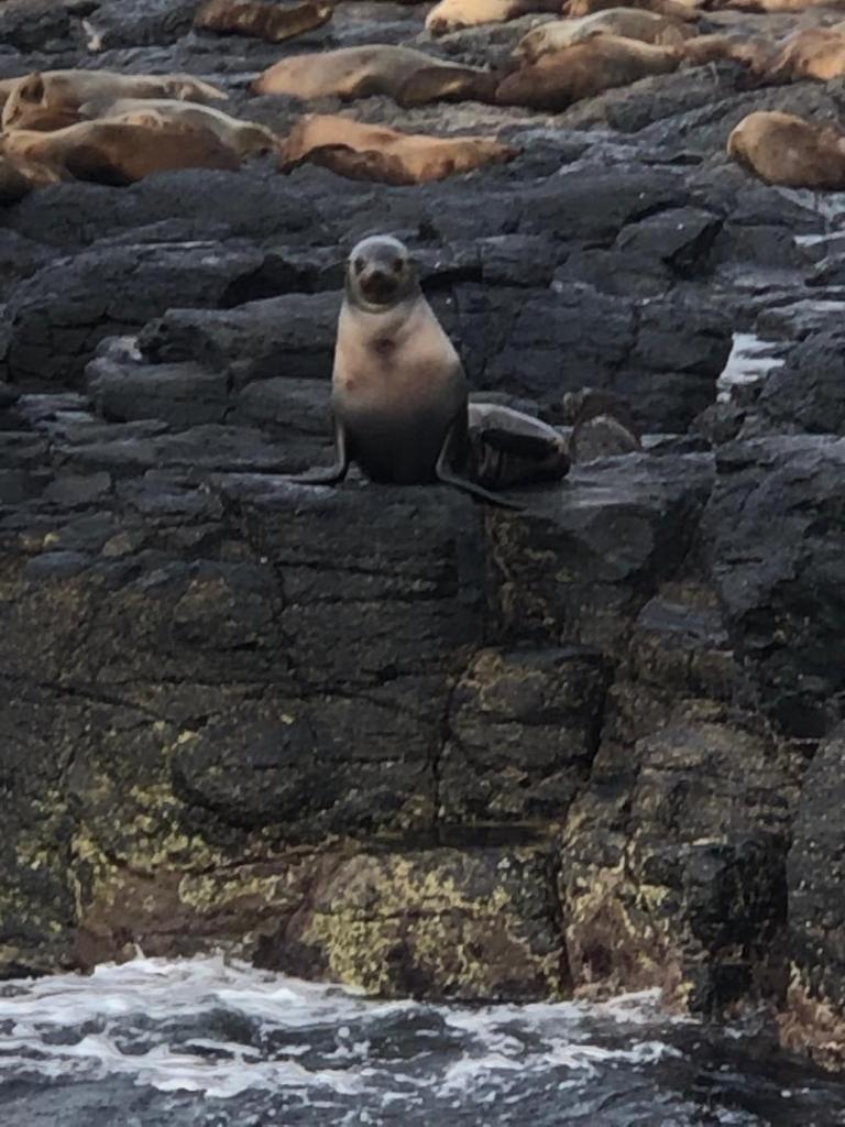 We anchored off village of Rhyll on Philip Island and took a very long tender ride into a their tiny dock. It was a very short walk to our catamaran to take us to Seal Rocks Island. The ride was bumpy and windy with swells as we followed the north shore of the island past the western edge to this little seal and bird only island. We were at the Bass Straight between Australia mainland and Tasmania. Known for its bumpy seas. We had thirty minutes during the high tide to enjoy the SMELLS, sights and sounds! Mostly cows and their pups but a few bulls. While we stayed there it went from cloudy to sunny. The ride back was much smoother!