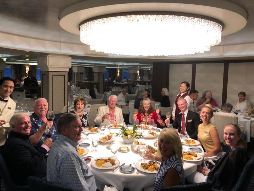 After our ride, the three of us decided to take a 20 minute shuttle bus to the town of Cowes. When we packed in January we were thinking all summer clothing was what we needed. HAHAHA! With a change of venue came cooler days. Larkin and I needed and found a few light weight sweaters on the streets of Cowes! Michael got bored and headed back to the long tender ride to the ship. Larkin and I walked all the way to the beach and pier from where they dropped us off. We collected our sand and enjoyed the volcanic and sand beach. We enjoyed seeing the people, the dogs and the birds. As we walked back to the shuttle bus we found a very busy and good inexpensive sushi restaurant and partook of their offerings! After the tender ride back we got ready for a Thai food night with friends. Once again the staff did a spectacular job! One Georgian and two Arkansans (and my Arkansas roots) and two dancers from the last cast…and our friends from Southern California!