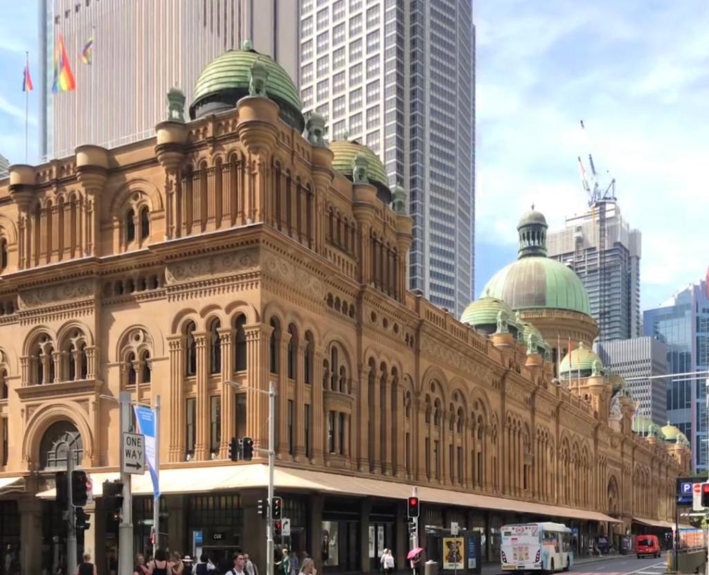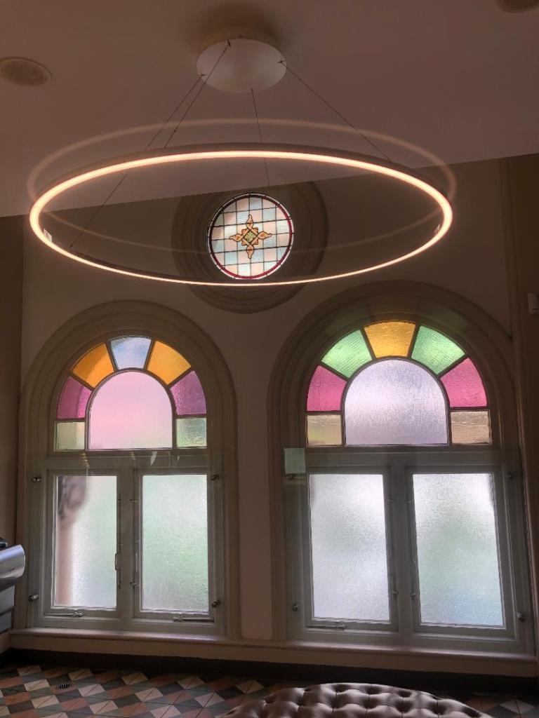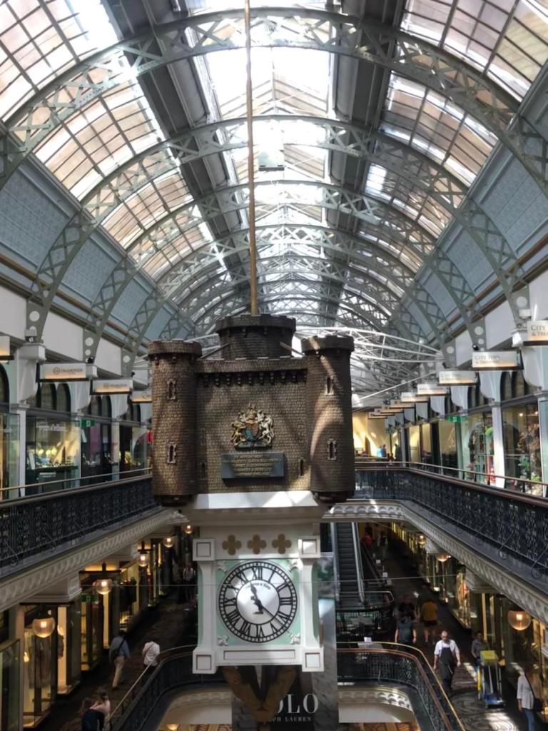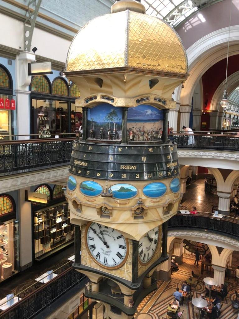Clocks in the Queen Victoria Building and stained glass in the ladies room with modern LED lights